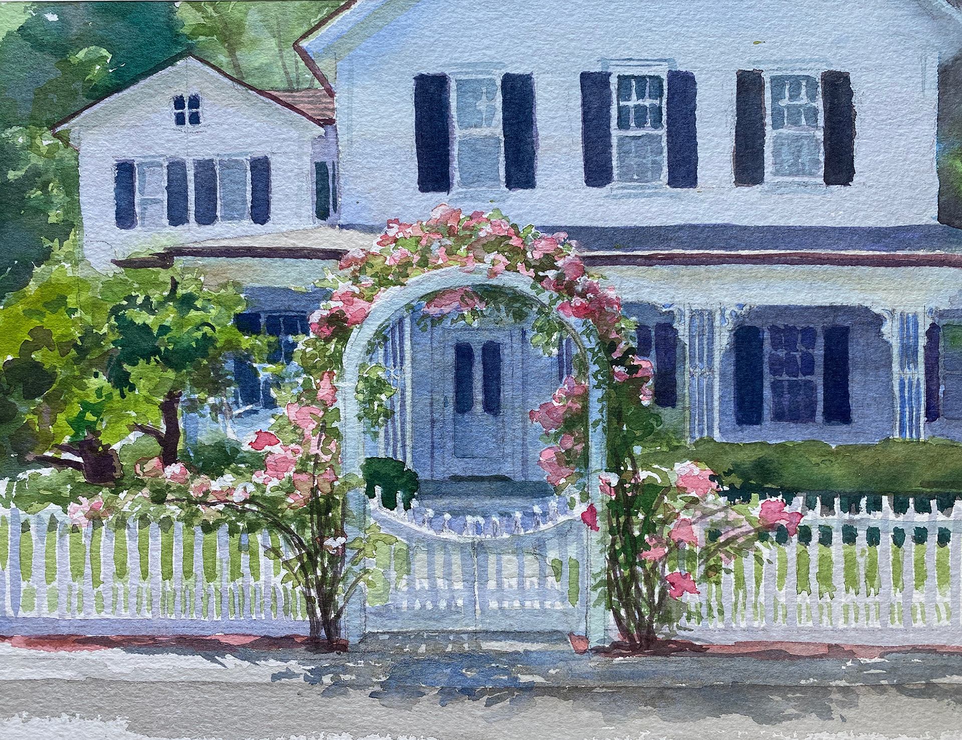 c 1853 Miss Augusta Smith's Seaside Seminary 1860–1907. The most beautiful roses in bloom in front of this historic home in Southport, CT. The charm of backlighting puts the house in shadow making the sunlit roses pop in this plein air painting.