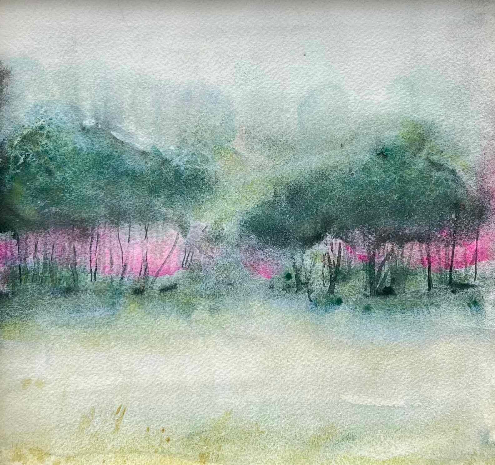 Abstract landscape on watercolor paper with highly pigmented paint. Mounted on canvas, natural wood frame. 8" x 8"