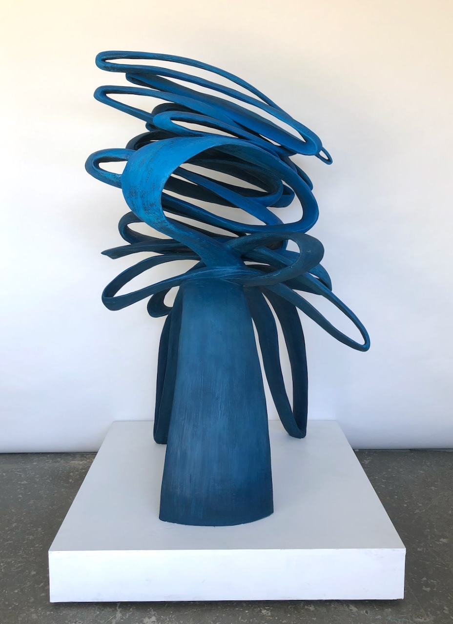 Although Blue Moves has a designated front view, it is meant to be seen from all sides or in the round, allowing the viewer to see the drama of the form unfold. It is an indoor sculpture.