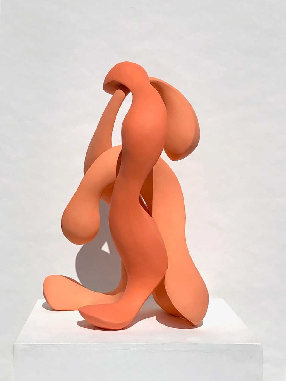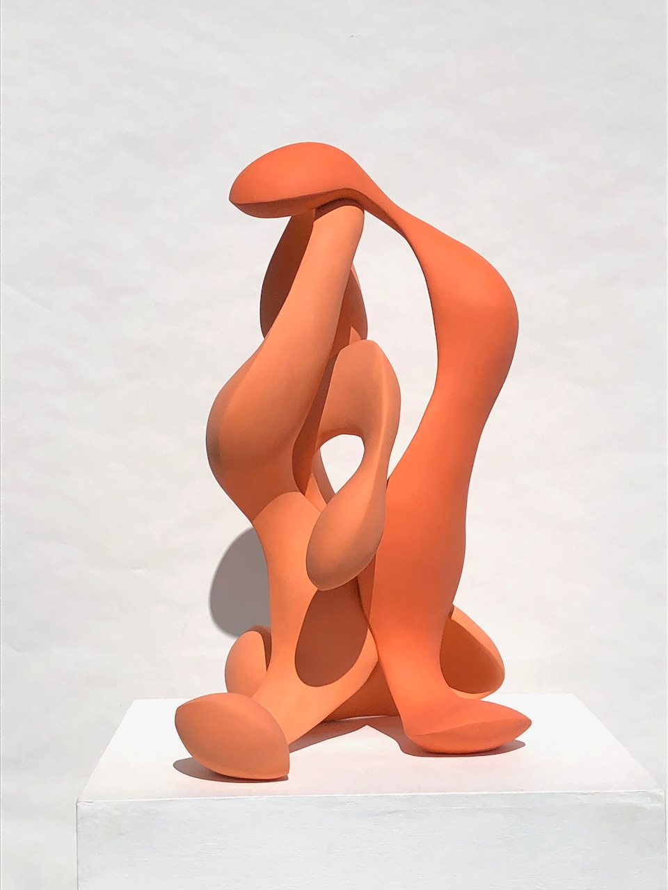 Although Tango Tangerine has a designated front view, it is meant to be seen from all sides or in the round, allowing the viewer to see the drama of the form unfold. It is an indoor sculpture.