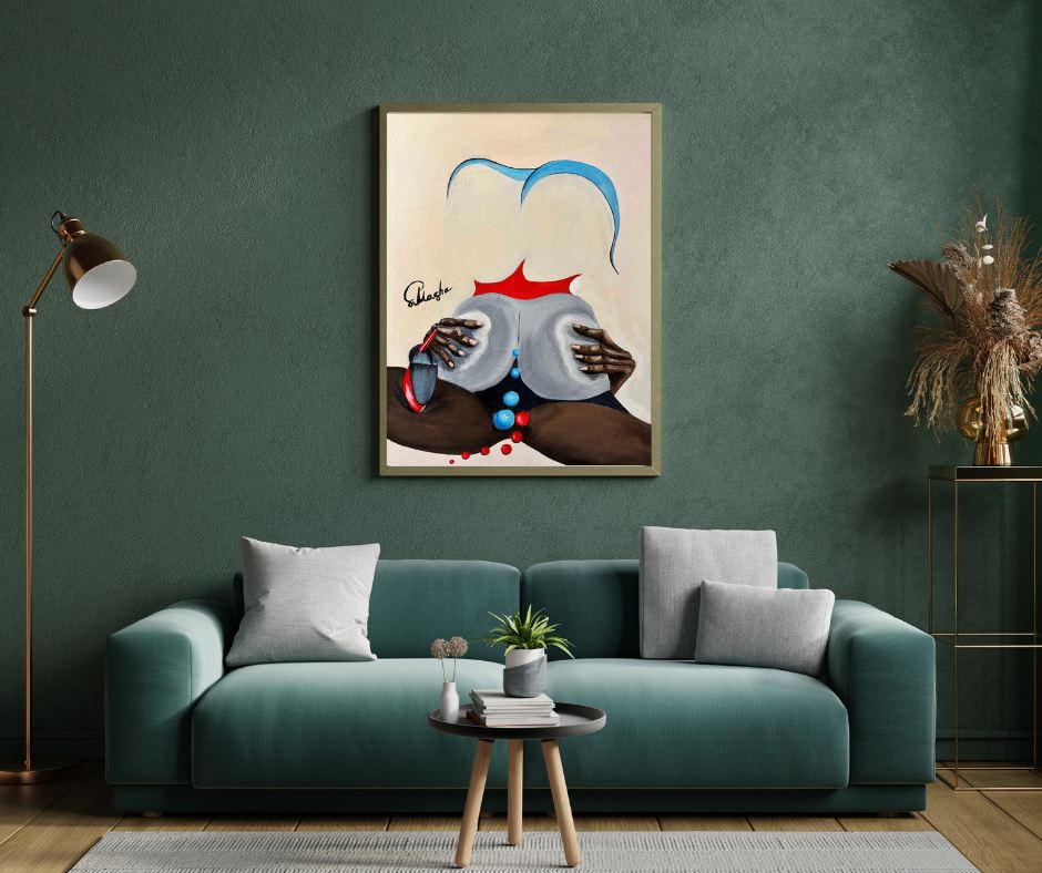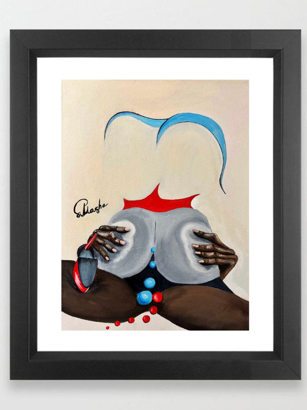 In Lunch Break, the act of desire becomes a metaphor for hunger far beyond the physical. A faceless figure, stylized in soft grays and accentuated by vivid red and blue accents, reclines confidently. Her hips are framed by large, expressive hands mid-grip, strong, focused, unapologetic. The pearls or droplets spilling below suggest indulgence, urgency, or ideas too ripe to hold back.