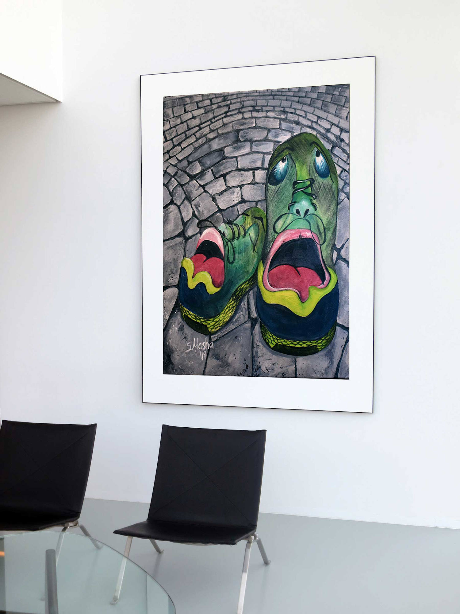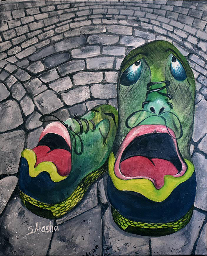 In Married Life, Schwartz transforms two well-worn sneakers into a pair of souls in constant dialogue, their open tongues echoing unspoken truths, late-night whispers, and the tolerance that comes when one partner endures the other’s midnight snoring. The exaggerated mouths capture moments of give-and-take of long-term partnership, where comfort meets conflict on every step. Subtle cracks in the bricks beneath them remind us that even the strongest unions require attention and repair. This piece reflects the humor, patience and unspoken vows that walk beside us every day and night.