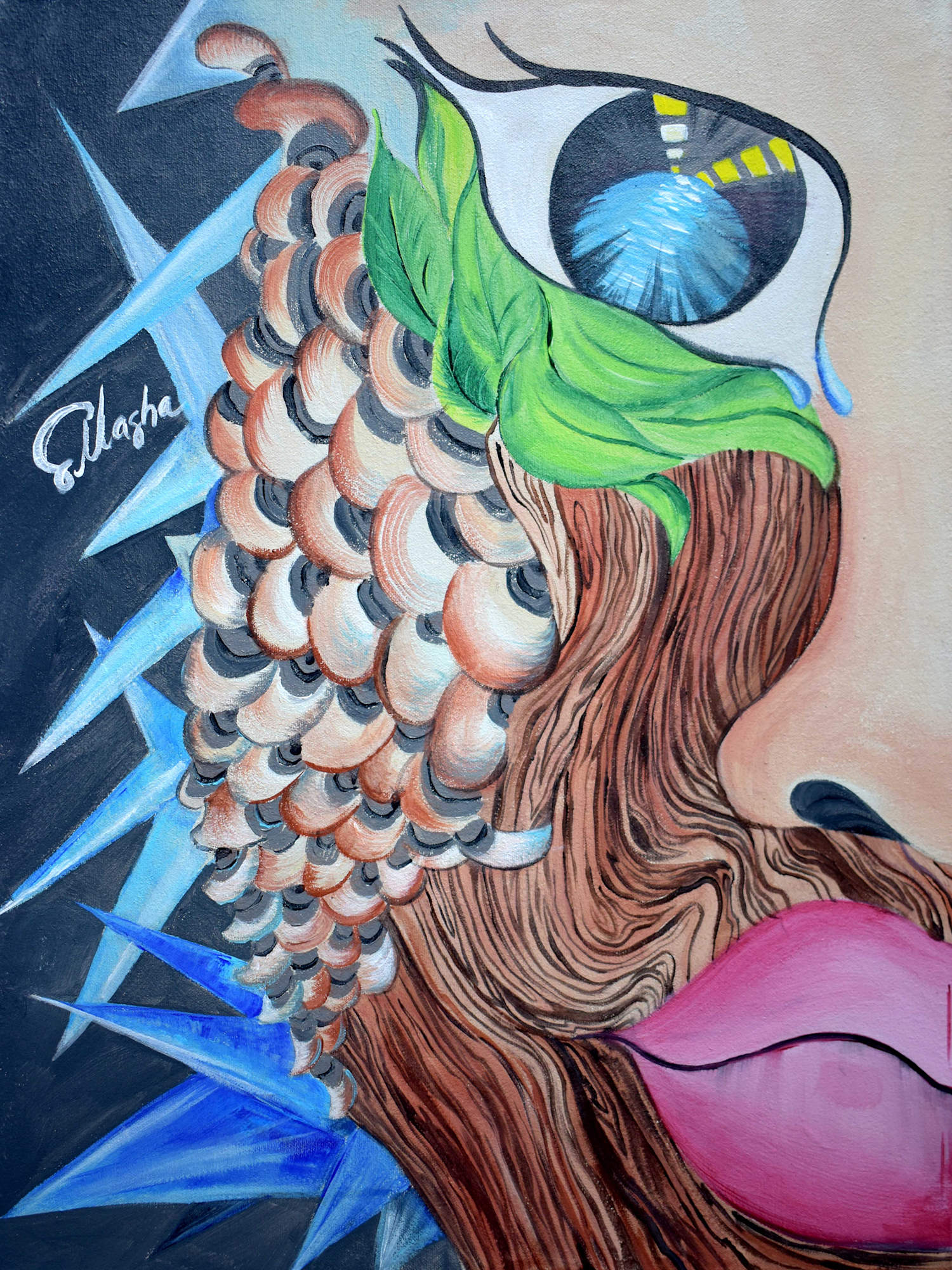 In Skins, Masha visualizes the many roles entrepreneurs adopt as layers of self. A single face merges organic textures: scales of adaptability, wood-grain persistence and foliage of renewal. Each “skin” representing a distinct facet of leadership. The eye, capturing a tunnel of light, sheds a single tear that reflects both the challenges endured and the vision that guides the path forward. This Surreabstract composition celebrates the resilience required to shed old skins, embrace transformation and step confidently into each new chapter of success.