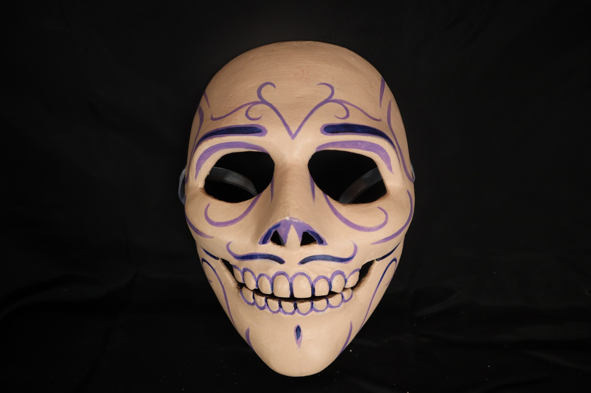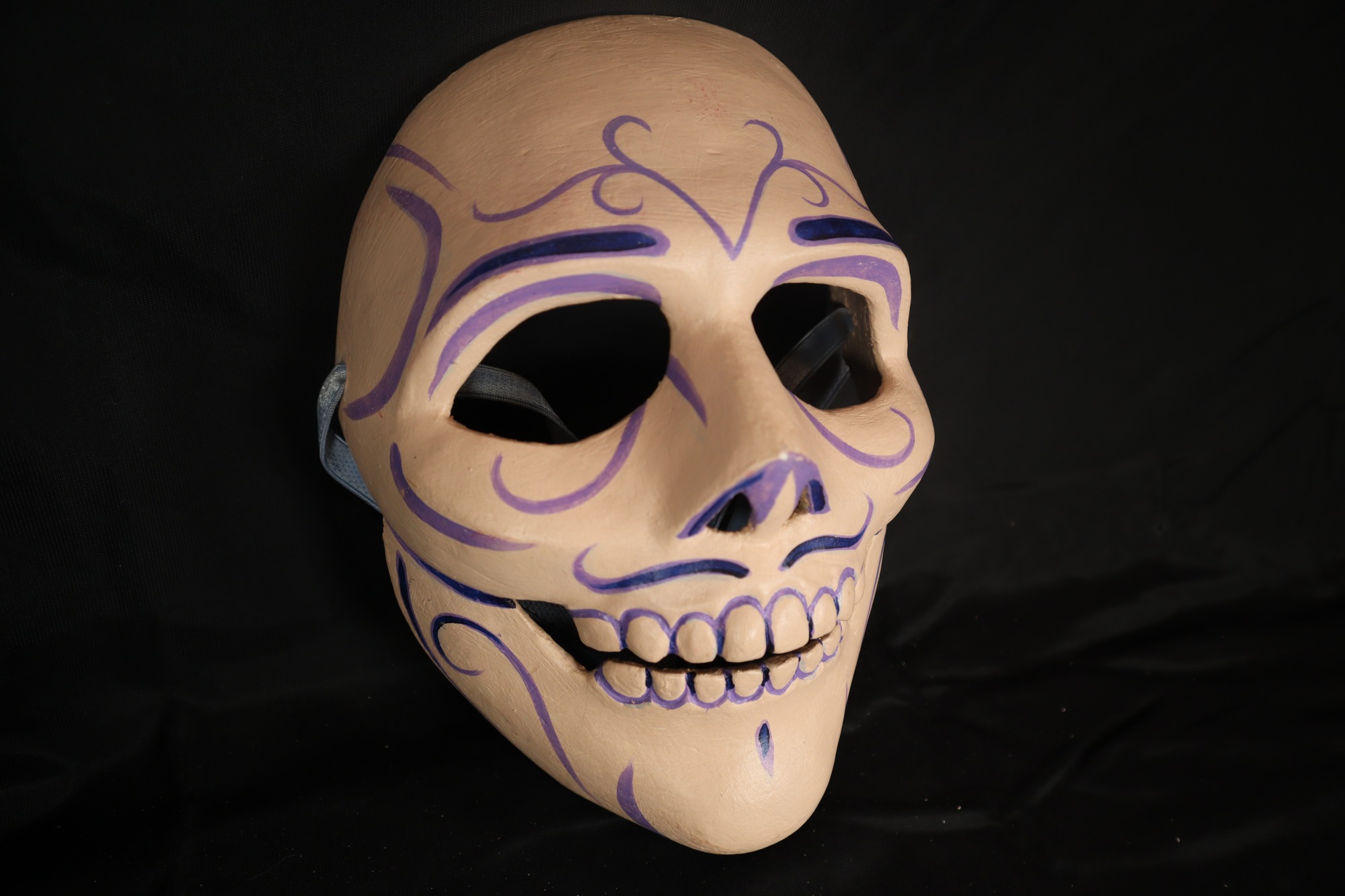AB. Full face mask used in performances by Arizona dance and theater companies. Purple and black painted calaca. Thin wavy and curvy purple lines on forehead in a V-like shape. More purple lines around the eyes, sides of mask, cheeks, nose and chin. Outline of teeth painted purple. Thin black lines painted on top of purple lines on eyebrows and chin. Thin separated handlebar-like mustache painted black.