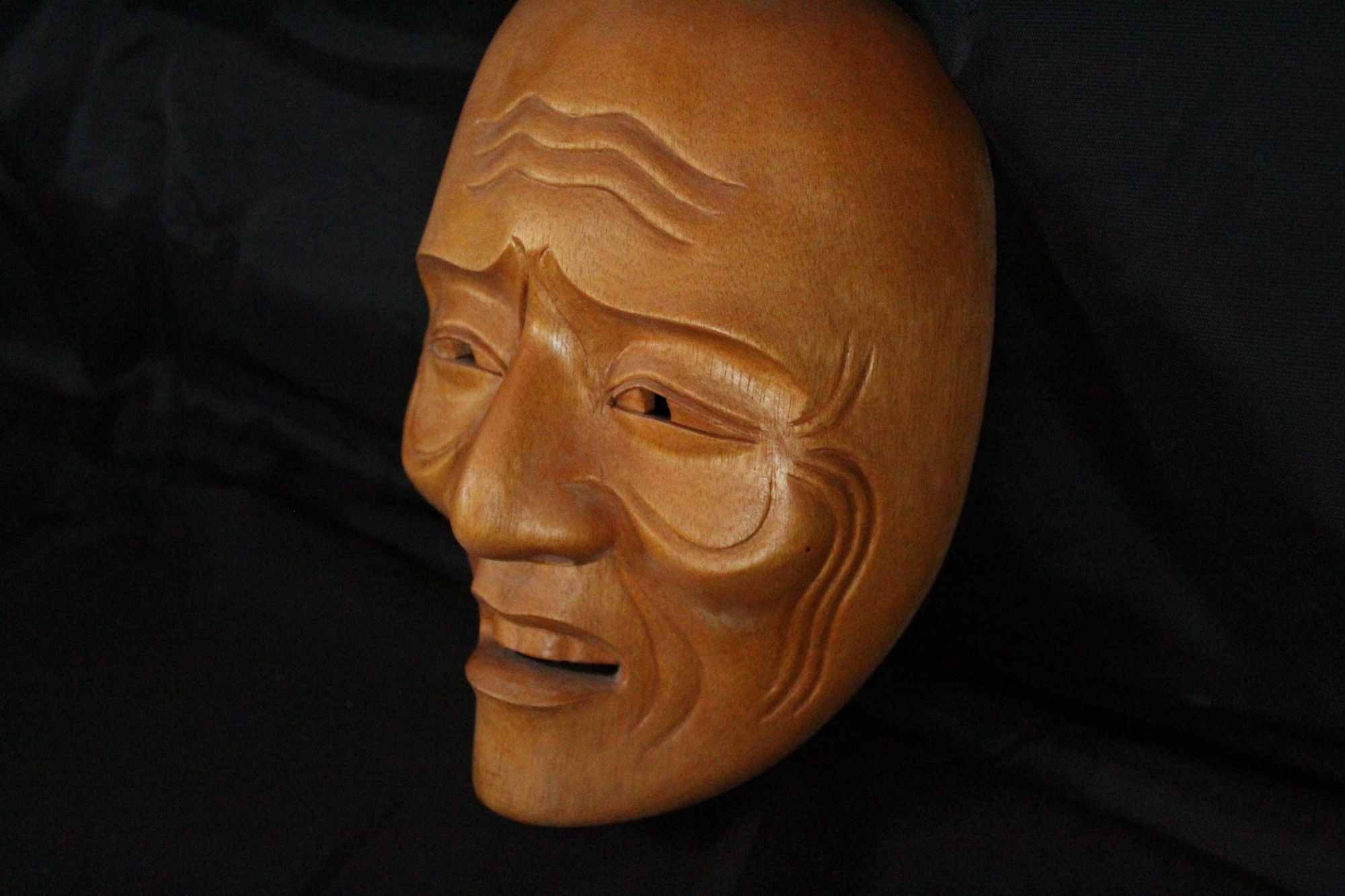 Three plateau shaped lines carved on the forehead. Almond shaped eyes, with square shaped pupils carved and punched out. Two vertical lines between the eyebrows, extending to nose bridge. Curved line on each cheek, following the cheeks bones. Two wood grain dots on the left cheek. Two vertical, nasolabial lines on each side of the mouth. Three curved wrinkle lines on the sides of each cheek. Mouth opened slightly with four teeth showing on the top row.