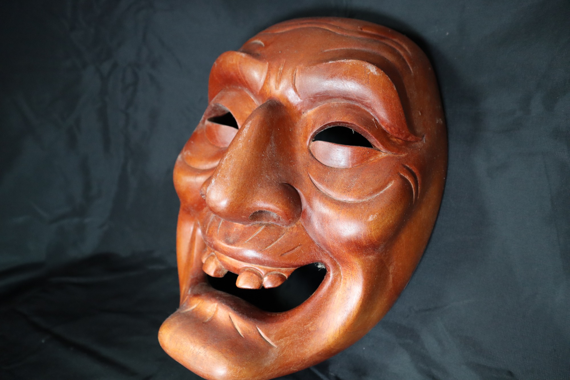 Two long wrinkles across the top of the forehead. One short wrinkle above both eyebrows. Eyes completely carved out in an almond shape. Periorbital edemas defined by carving a shallow line underneath the eyes. Two short wrinkle lines just below the eye and on the cheeks. One wrinkle line on each cheek, following the cheeks' natural curve. Six vertical wrinkles lines above the top lip, four lines below the bottom lip. Mouth opened and smiling. Four teeth showing on the top row, with a gap in the middle.