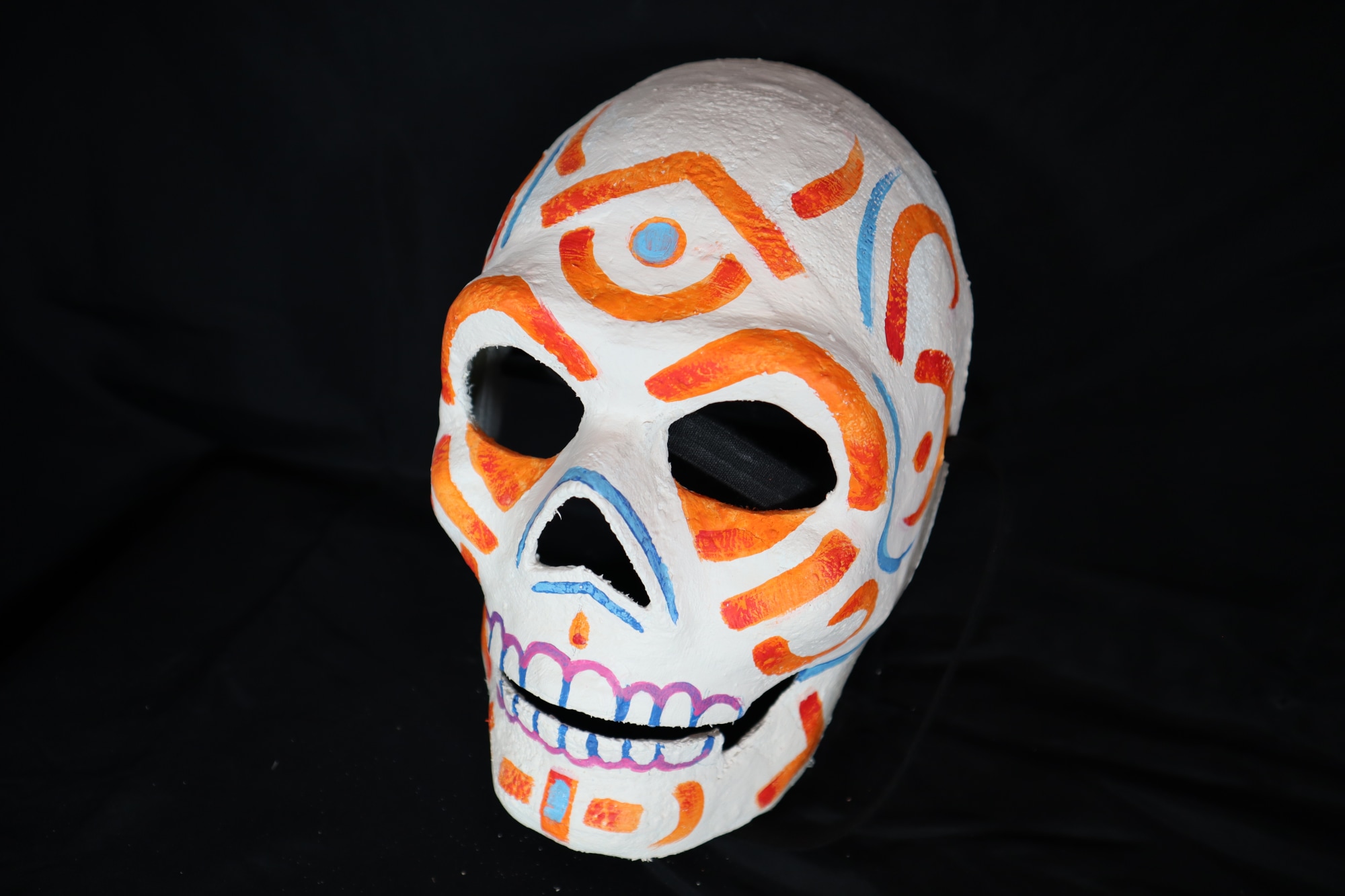 Axé VI. Full-face calaca skeleton mask made of plaster bandage and paper clay, painted with acrylic paints and ribbon, which ties the mask to the performer. Orange upside down V on forehead with a blue circle outlined in orange beneath it sitting in an orange C shape. Orange arched eyebrows, and triangles beneath the eyes. Thick orange lines along temples, cheeks, and jaw, with thin blue lines on forehead, around nose, and sides of face. Chin has three orange block shapes with the center one having a blue block in its center. Teeth are outlined in pink and blue.