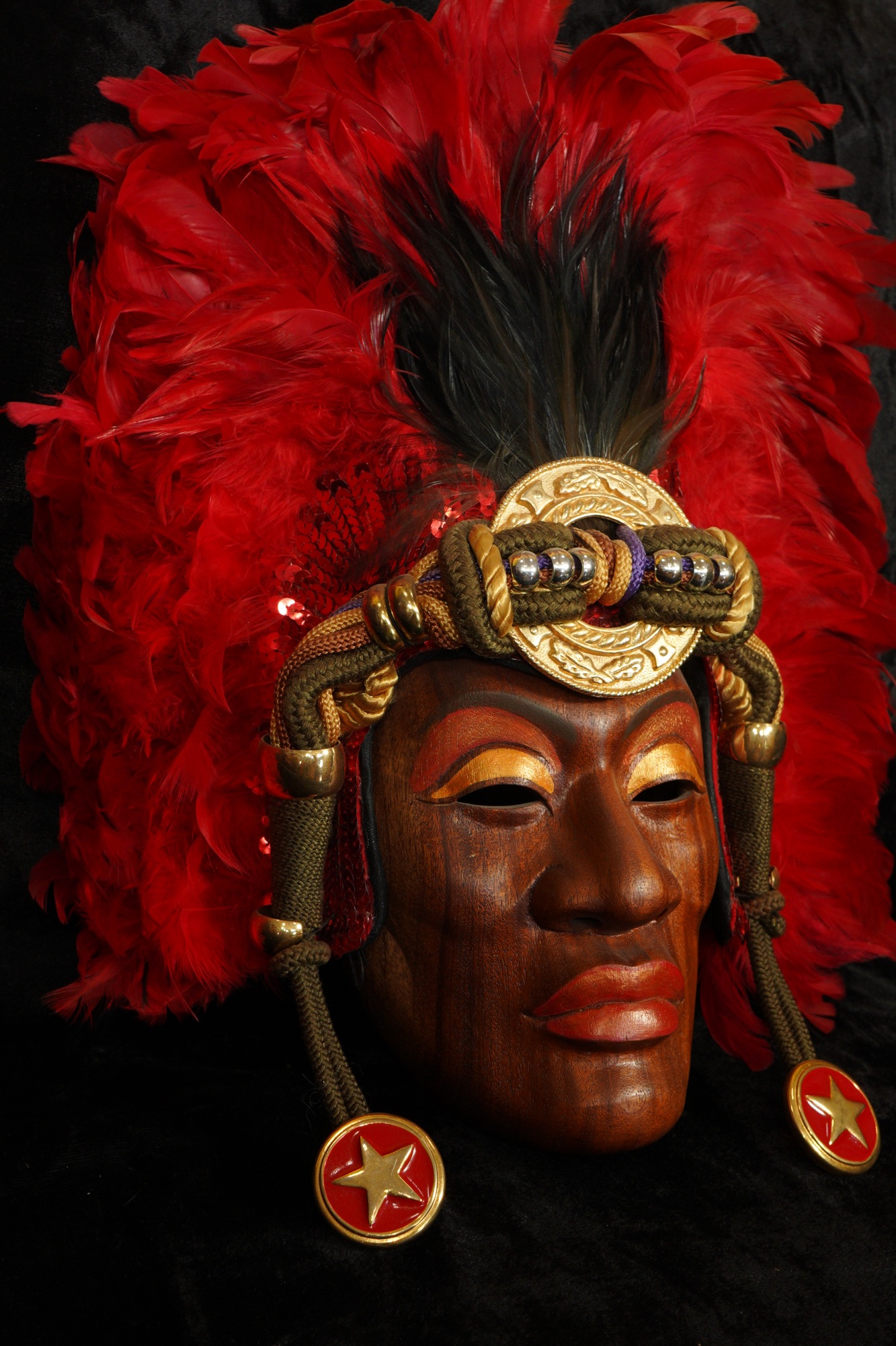 Dark brown wood carved mask with gold and orange eyeshadow, and painted orange lips; deep blood orange feathered headdress with black feathers at top center, and large gold circle medallion in center with rope and beads hanging on each side of the mask with red medallions with gold starts hanging from each side.