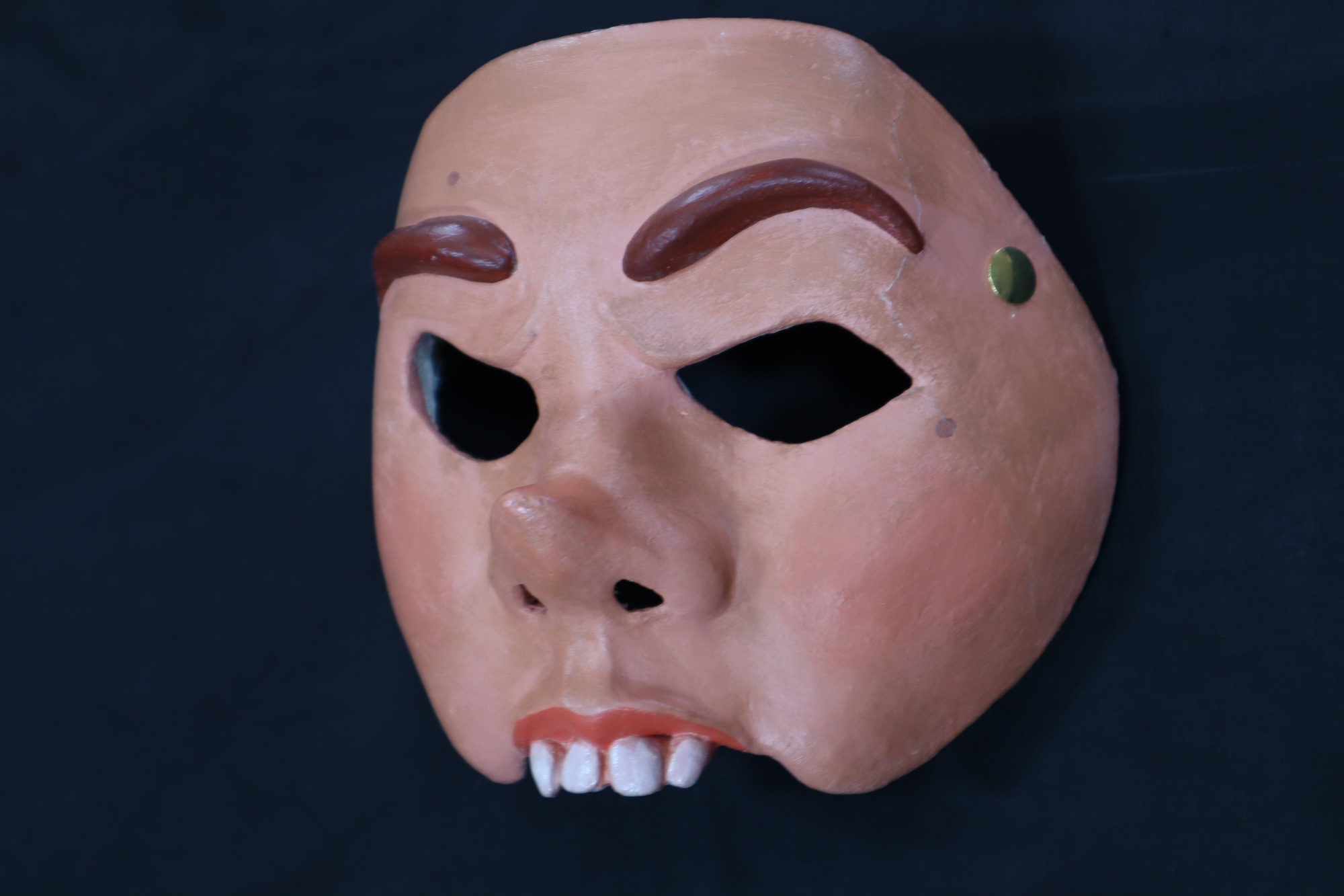 Named after person who performed in mask. Used for performances and in the Cultural Coalition 2014 El Puente Festival. Half mask of woman's face with upturned nose. Painted brown eyebrows, pink upper lips, four white teeth.
