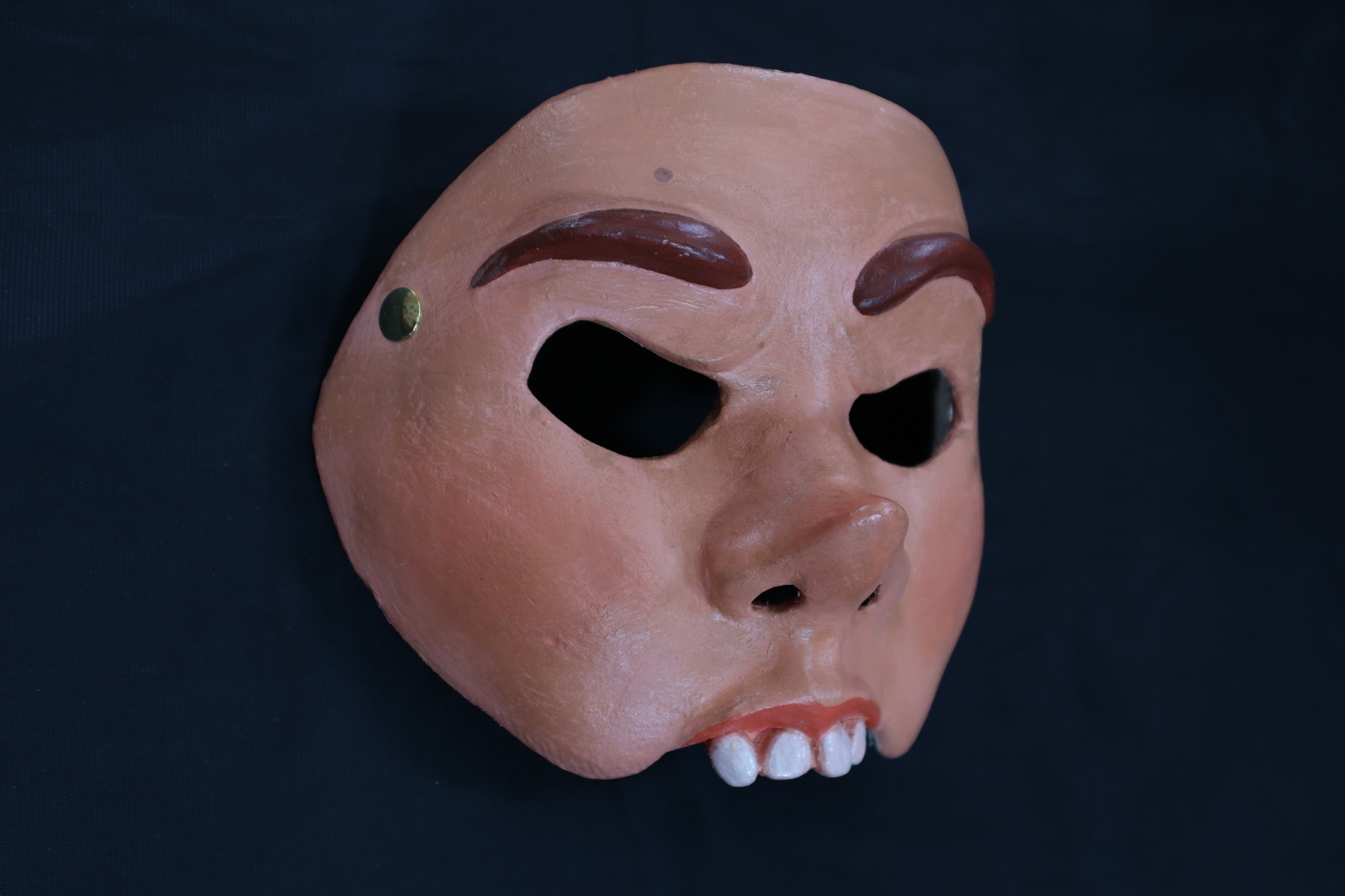 Named after person who performed in mask. Used for performances and in the Cultural Coalition 2014 El Puente Festival. Half mask of woman's face with upturned nose. Painted brown eyebrows, pink upper lips, four white teeth.
