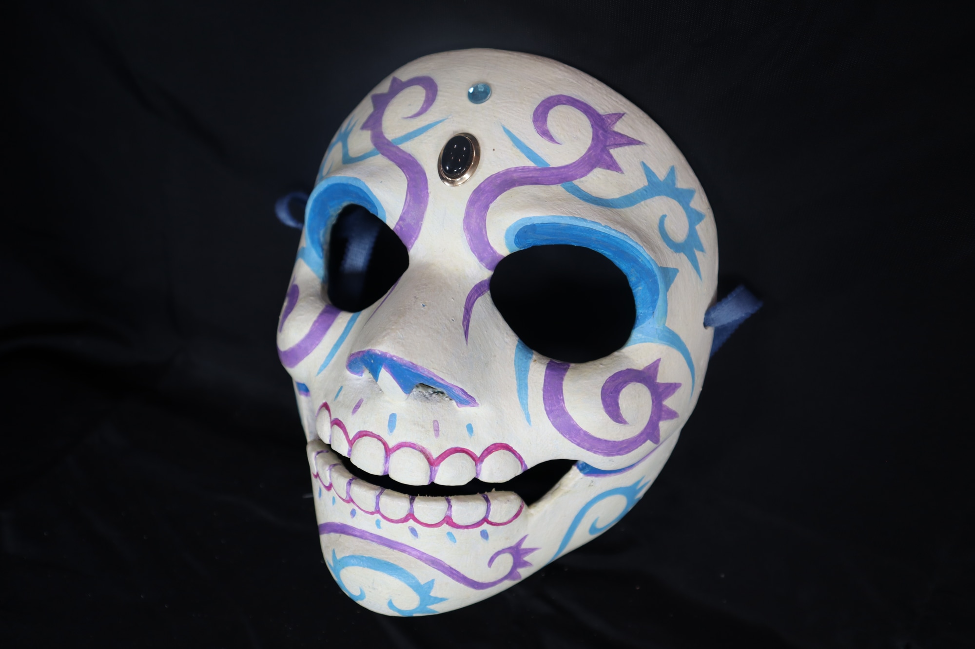 Full face mask used in performances by Arizona's dance and theater companies . At the center of its forehead is a round metal charm. Above it is a blue gem. The eyes are outlined in dark blue with a light blue edging and purple flame-like swirls going out from the top and bottom of the eyes. The teeth are outlined in purple and pink, and the chin has a large purple and blue flame-like design matching the forehead.