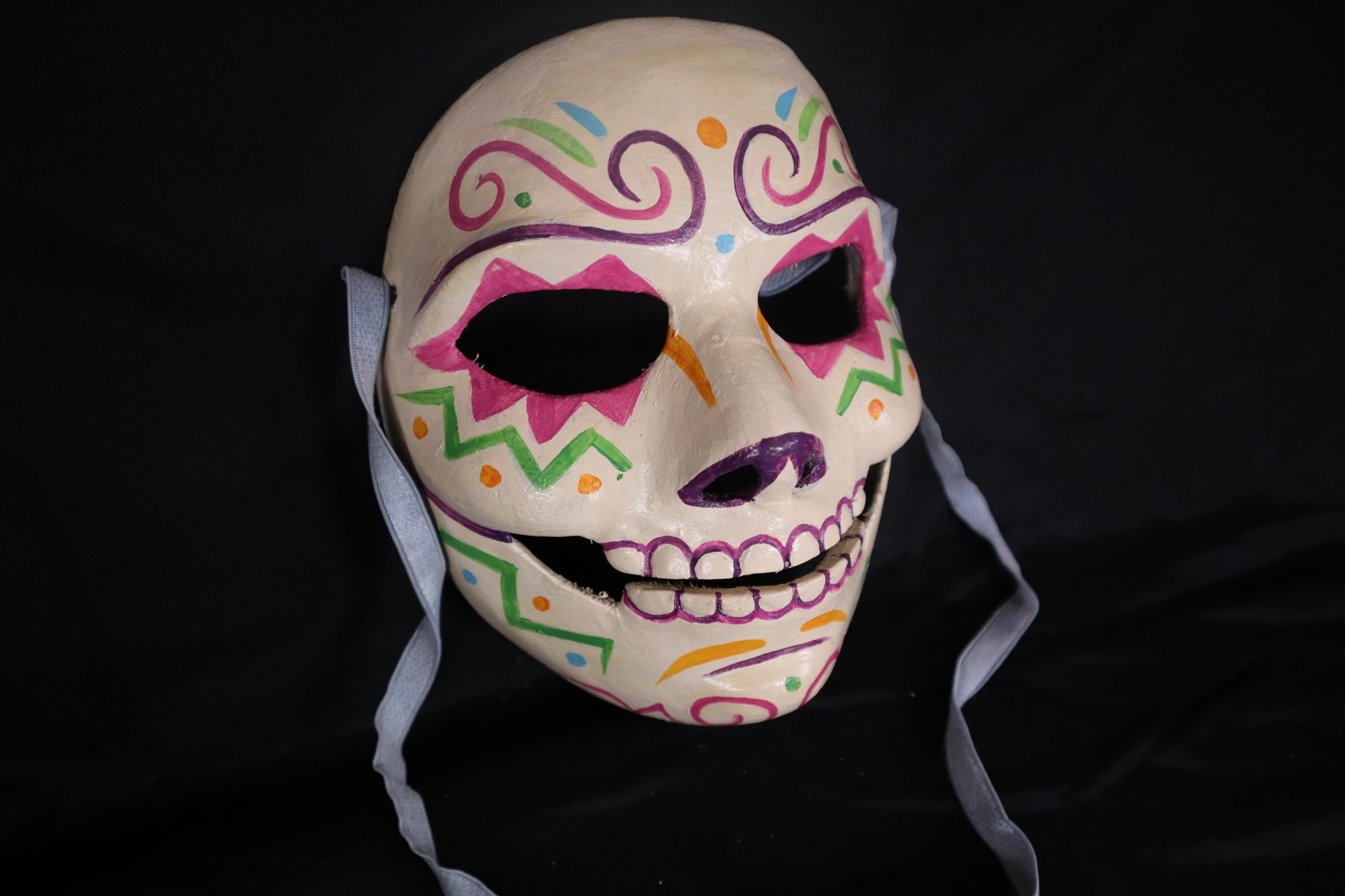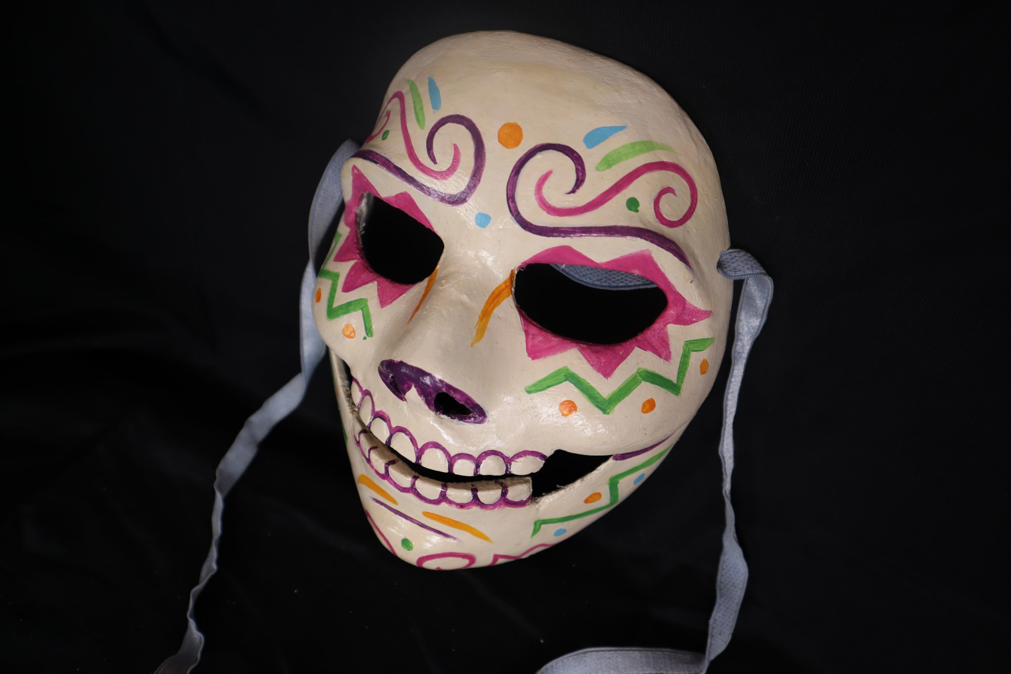 Calaca #52. Full face mask used in performances by Ballet Folklorico Quetzalli-AZ of Chandler, AZ. Intertwined swirls of pink and purple on forehead with orange dot in center and green lines above. Eyes have pink triangle shapes all around them with green up and down lines with orange dots below them. Teeth are outlined in dark pink with green lines, orange lines and pink circles around the jaw line and chin with different colored dots all around.