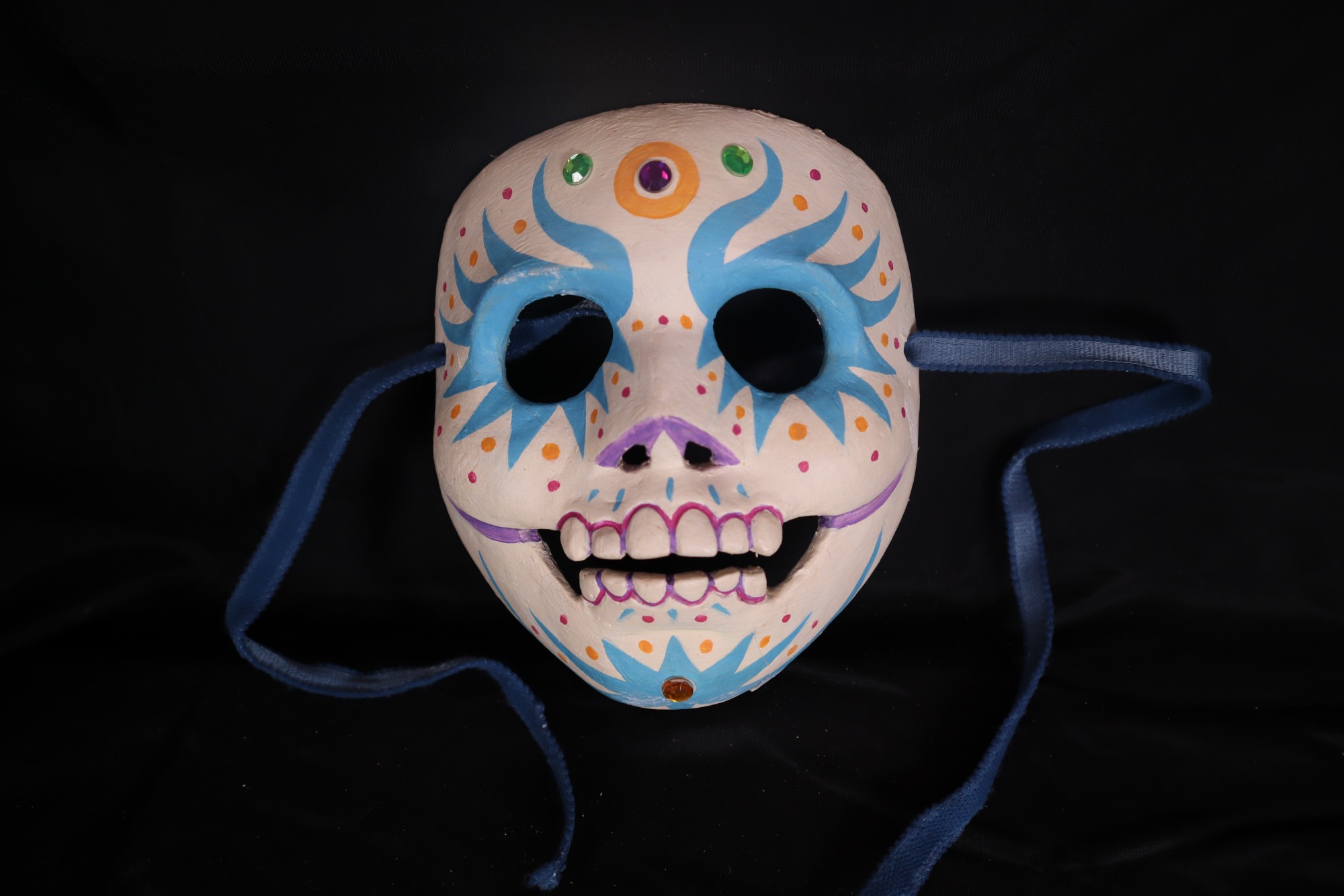 Calaca #80. Full face mask used in performances by Arizona theater and dance companies. It is squared off at the forehead. Outlining the eyes are blue sunlight designs with golden dots from the ends. At the center of the forehead is a large yellow circle with a gym at the center and two smaller green circles on either side. The nose is bright purple, and the teeth are outlined in pink and purple, and on the chin is a matching sun-shaped design with yellow dots coming out of the ends and a rhinestone at the center.