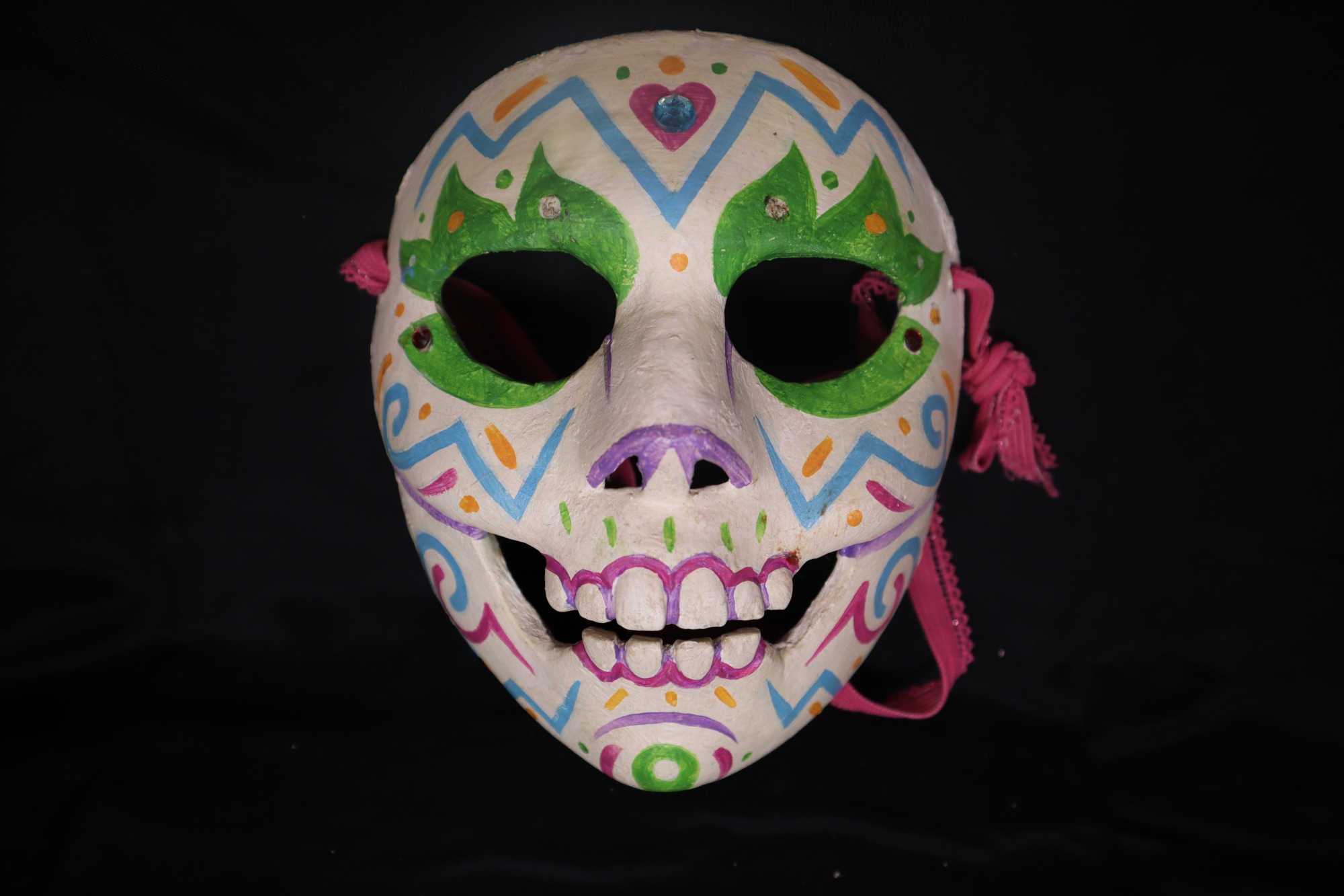 Calaquita #43. Full face mask used in performances by Arizona theater and dance companies. It has eyes outlined in large green leaf-like shapes with silver, gold, and purple gems on each leaf. A purple heart with a blue gem inside is at the center of the forehand. Above it is a yellow dot and two green dots on each side, and under the heart is a V-shaped blue design. The nose is a pale purple the teeth are outlined in pale purple and dark pink. The cheeks have yellow, blue, and pink V-shaped swirl designs, and the chin has blue, yellow, purple, and pink designs with a green circle at the center.