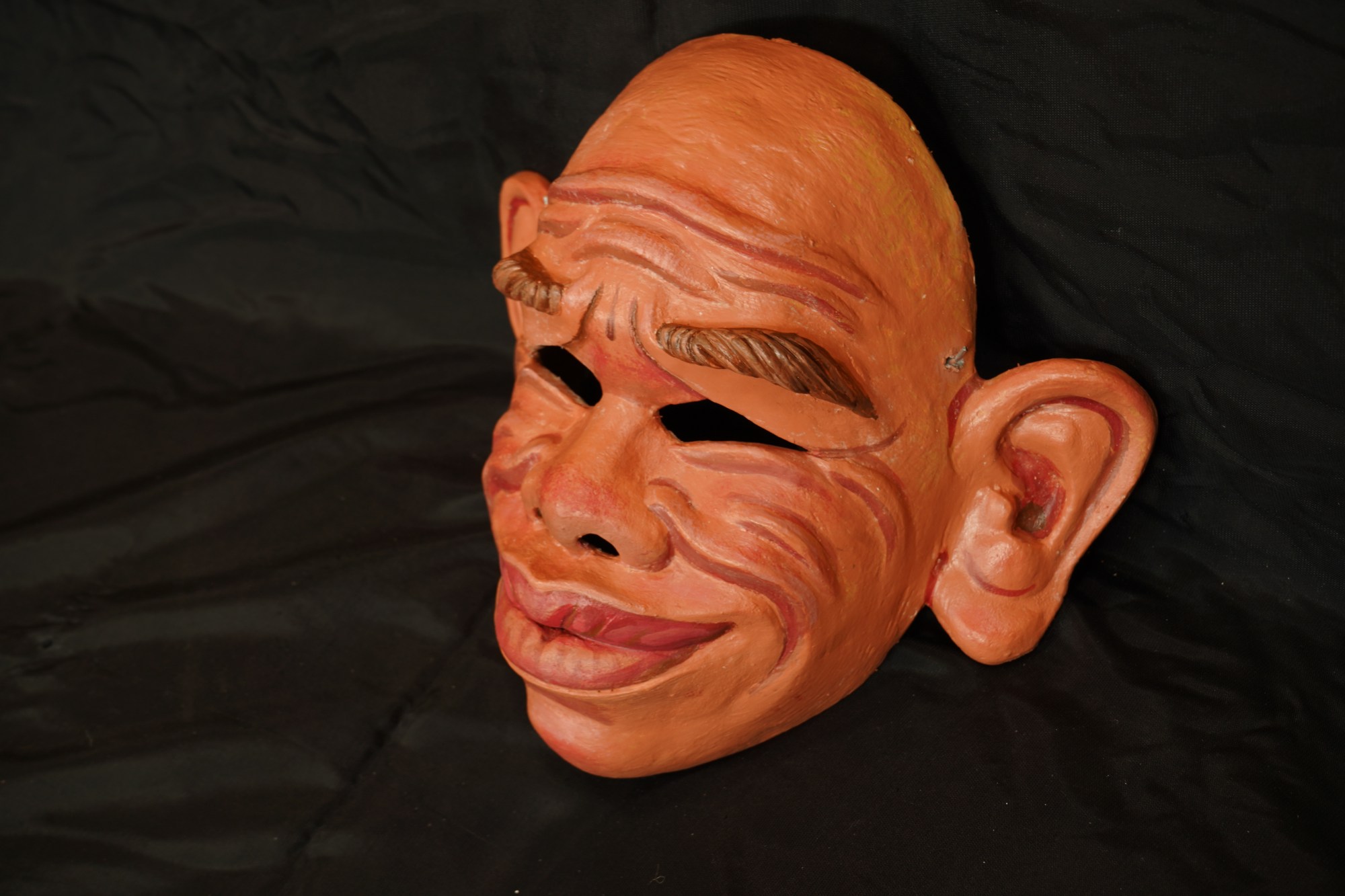 Tan skin tone base. Large ears that stick out. Large, pink lips with a closed mouth smile. Wrinkle lines throughout the entire face. Four wrinkles carved onto forehead. Narrow eyes carved out.