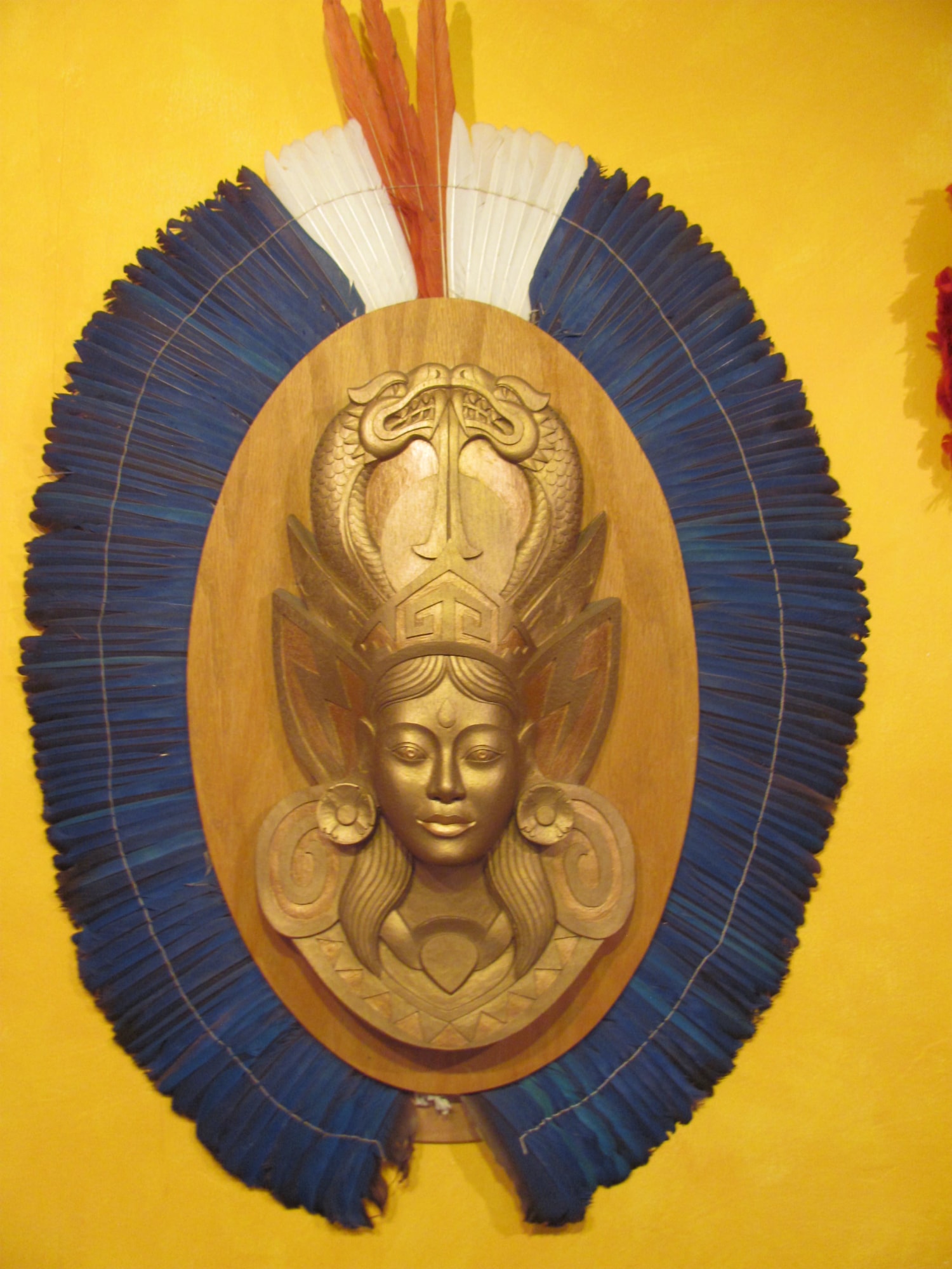 Gold painted carving of woman face, with double serpent headdress; mounted on oval shaped piece of wood with blue, white, and orange feathers around the edges, Fiberglass cast from wood carved piece, with Amazonian feathered headdress