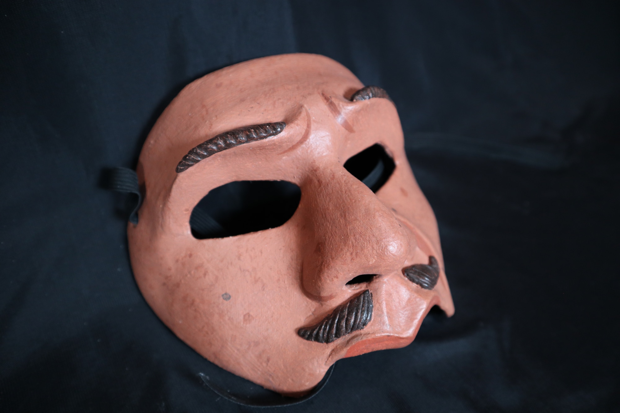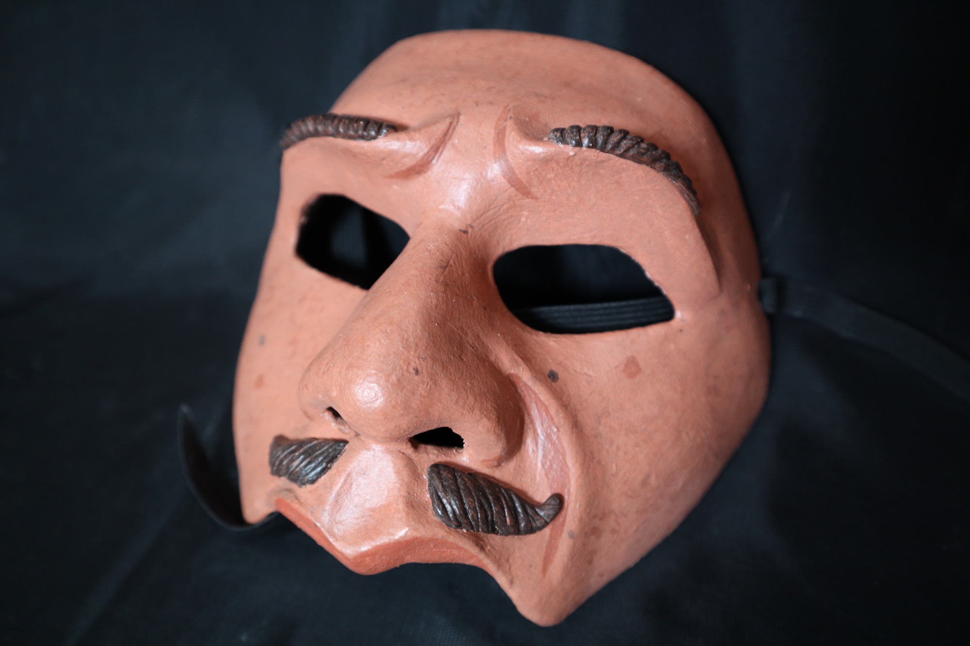 Cyrus. Plaster bandage paper clay, painted with acrylics. Half mask of male figure used for theatrical productions. Expression is questioning, with eyebrows furrowed, lines painted in between and left eyebrow slightly raised. Thin sculpted and raised eyebrows painted brown. Separated mustache, with small check mark shaped sections painted dark brown on either side of grooves above the upper lip. Left cheek has wrinkle around mouth from the expression. Multiple small light colored moles or age spots painted on the face.