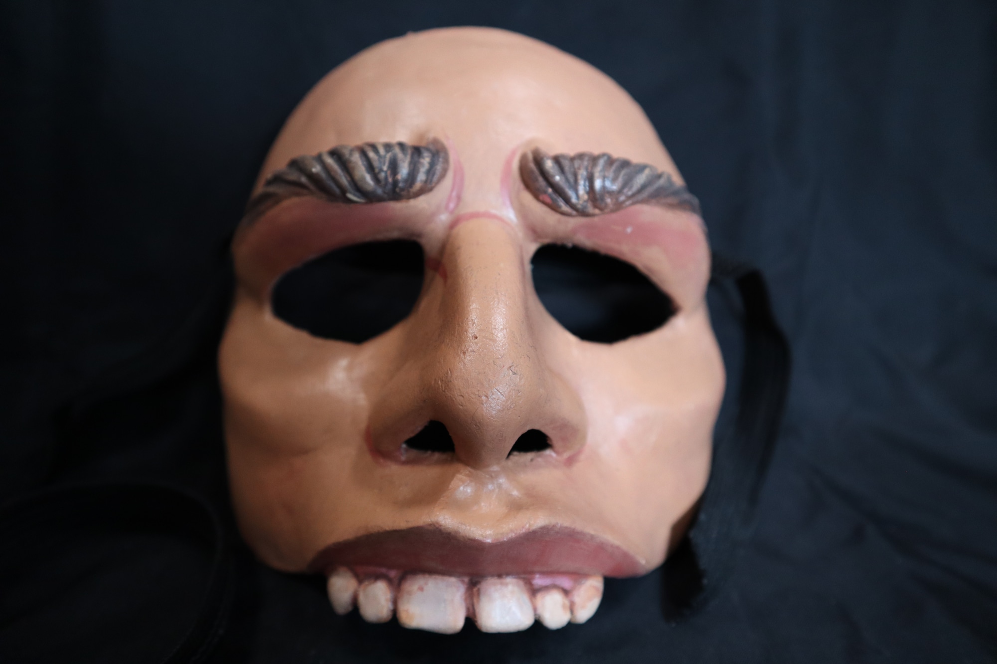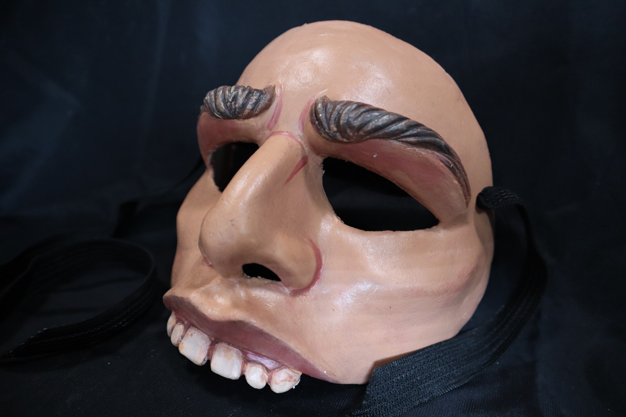 Dentón. Half mask made of plaster bandage, paper clay and painted with acrylic. Used in theatrical productions. Sculpted and raised brown painted eyebrows. Large nose, sharp carved cheek bones. Upper lip carved to stick out and curl up on both sides. Six large white square teeth protrude from upper lip.