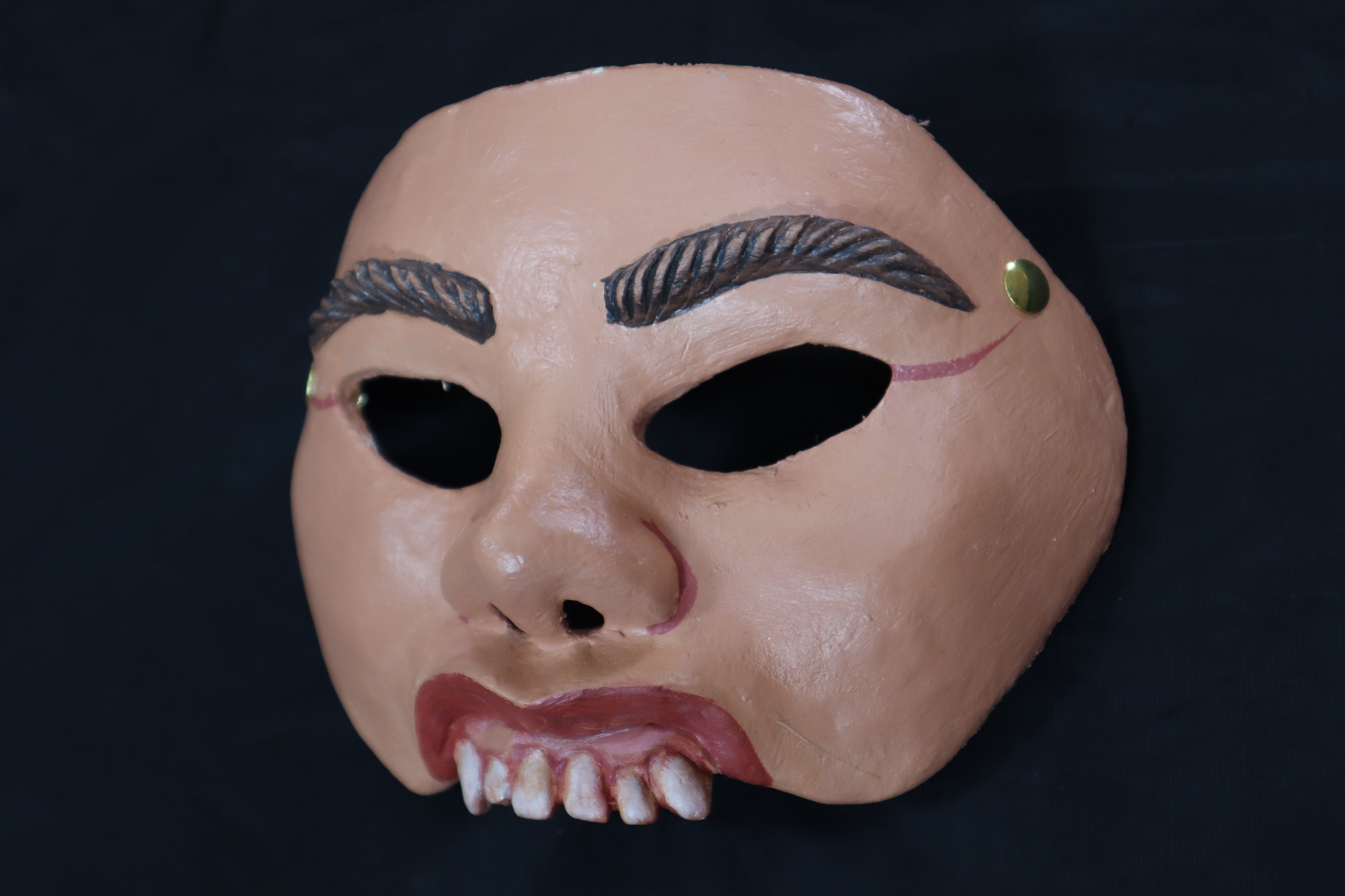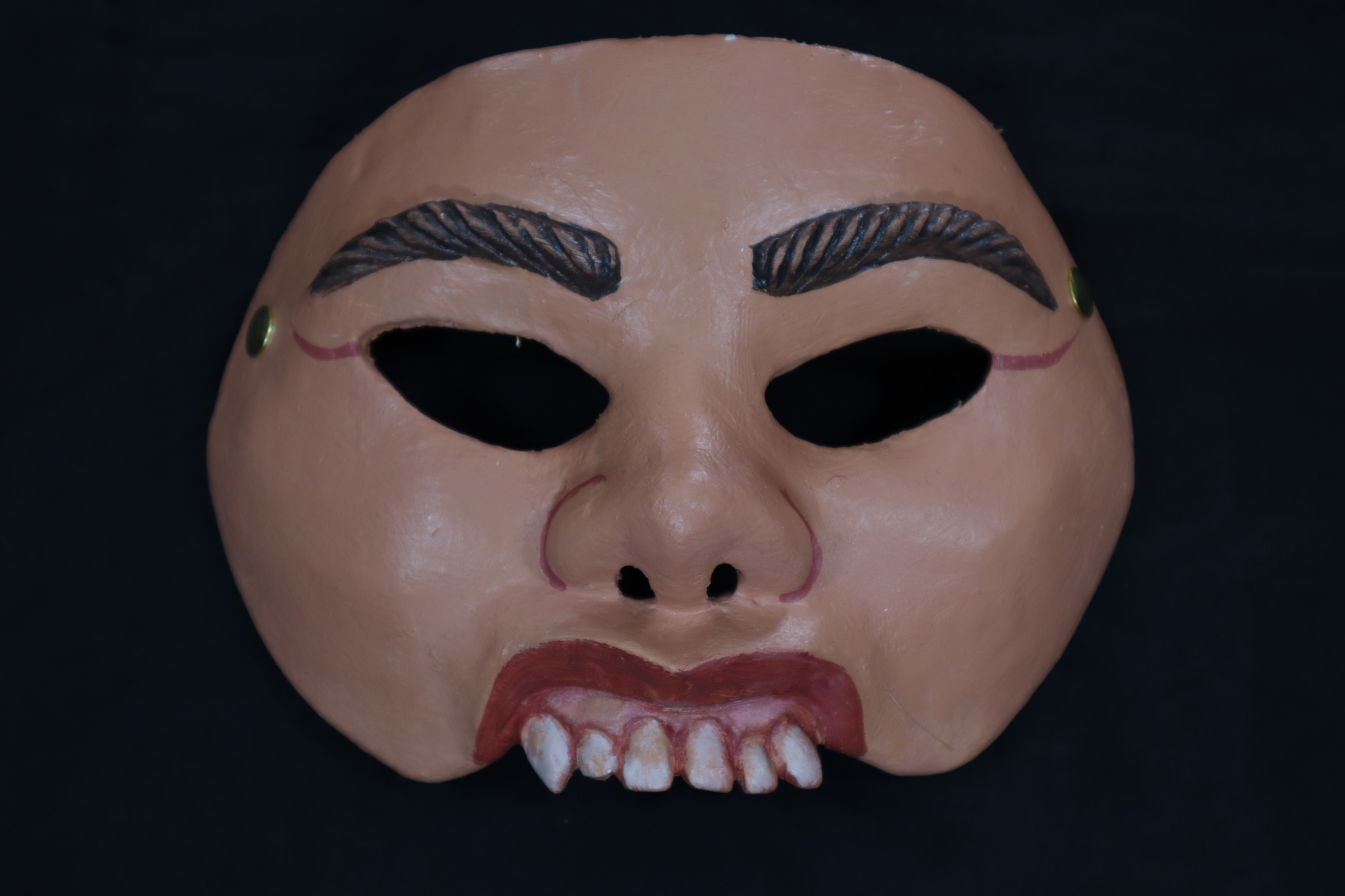 Dientes. Wide half mask. Painted lighter tan with brown raised eyebrows. Thin painted red colored lines coming from sides of eyes and around nostrils of slightly upturned nose. Upper lip painted red and curled to reveal six painted white jagged teeth.