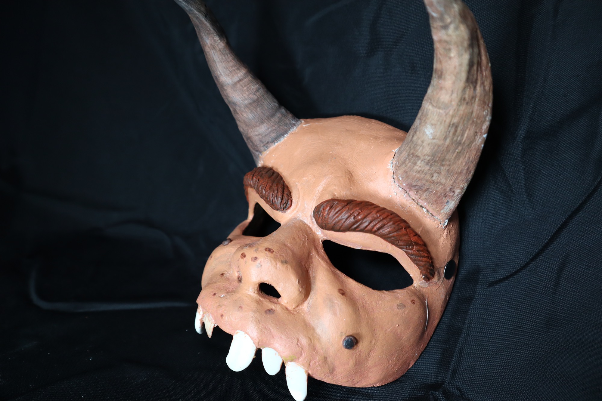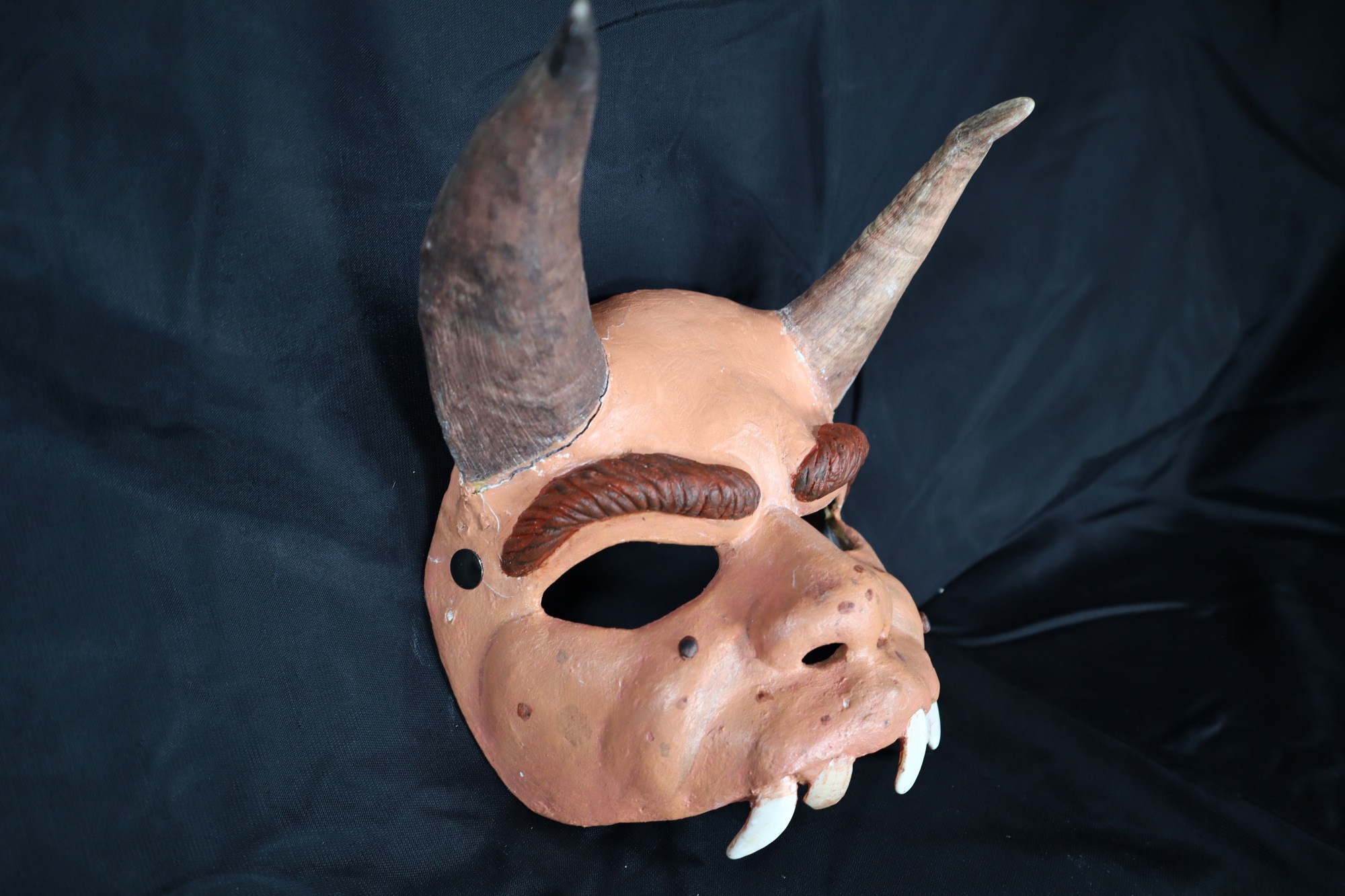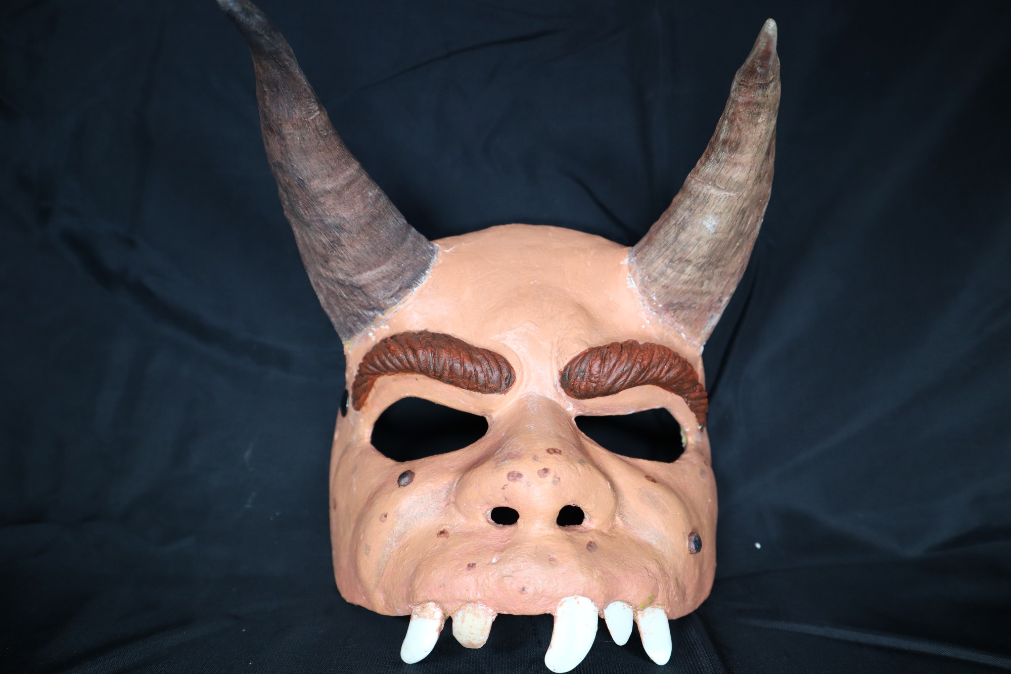 Half mask with goat horns. Face has many painted and sculpted moles all over the cheeks, nose, and above the lip. Eyebrows are sculpted on top of mask and carved with hairlines, painted brown. Nose is upturned to show nostrils. Five misshapen teeth of varying length made from shell protrude from a non-existent lip. Three teeth on the left side with a gap in the middle and two on the right.