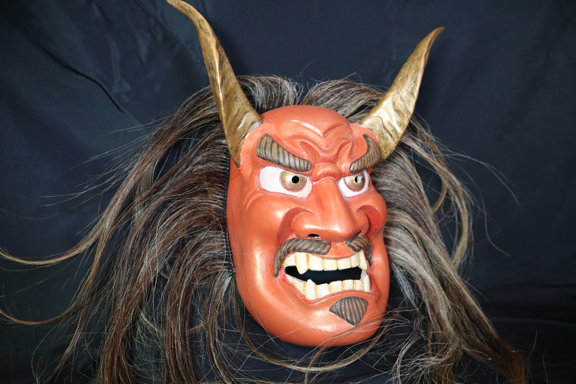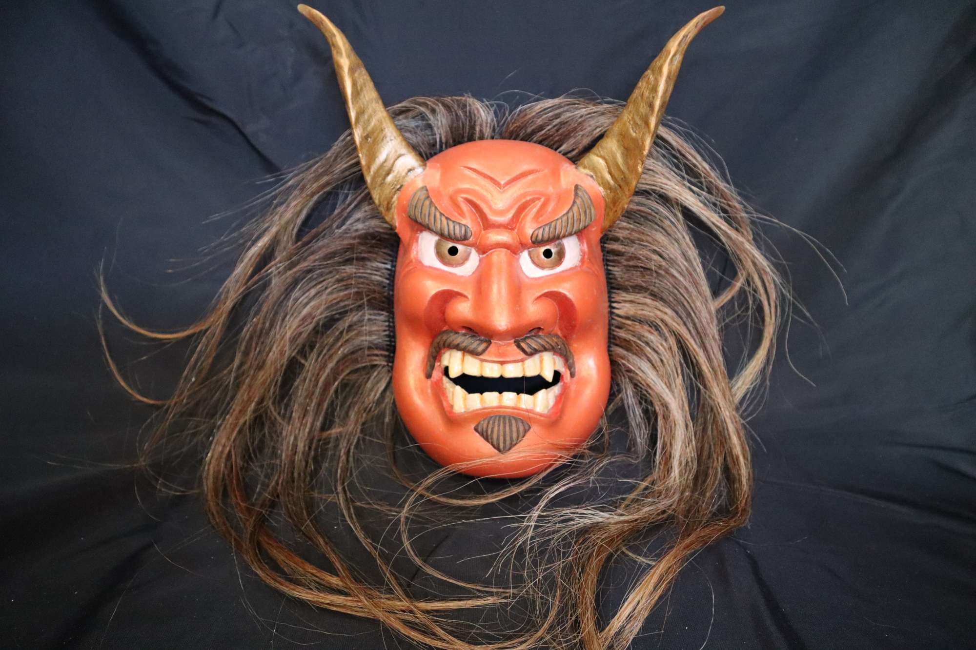 Full mask of male figure with goat horns and dark brown hair. Expression of mask is angry. Eyebrows painted brown and carved to point upward on the sides of the forehead. Carved V shaped wrinkle and furrowed brows in center for forehead. Eyes are pounded copper circles with holes punched through center and white paint on the sides. Separated mustache extends to sides of mouth and then goes downwards, painted brown. Mouth carved in a wide growling expression, with lower lip having two downward facing points. Lips painted red. Full set of top and bottom teeth are painted a light yellow. Teeth edges are all very flat and smooth except the incisors and lower canines which are long and pointy. Lower lip has a patch of hair carved in an upside down triangle shape, also painted brown. Overall mask painted a reddish/orange color.