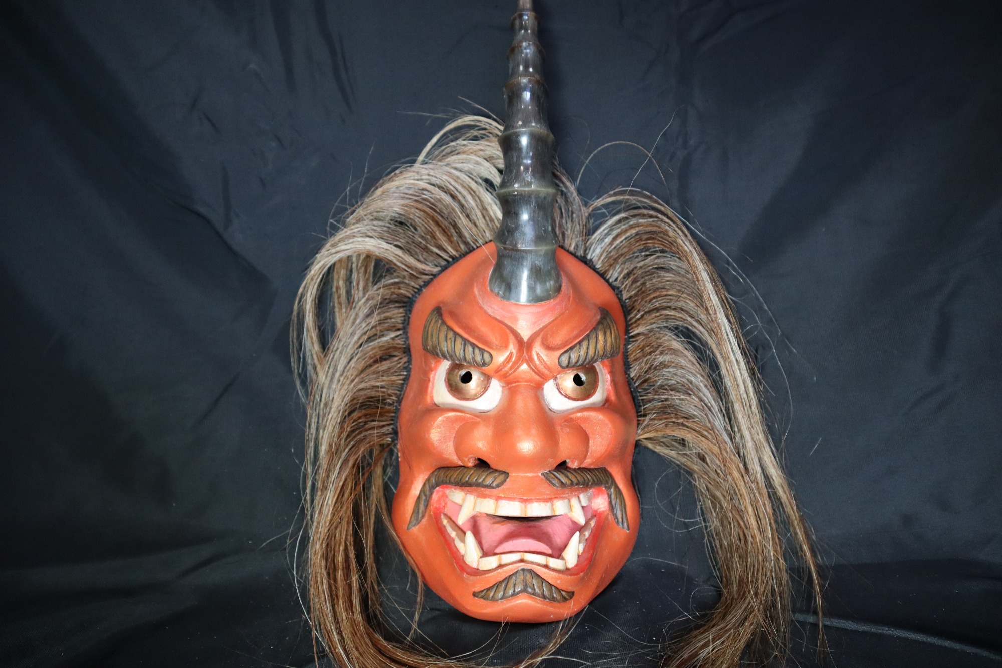 Full mask of male figure with a single modified/carved buffalo horn in center of forehead and light brown/blonde hair. Expression of mask is angry. Eyebrows painted brown and carved to point upward on the sides of the forehead and slightly covering the top of the eyes. Carved lines and furrowed brow wrinkles in the center of forehead. Eyes are pounded copper circles with holes punched through center, outlined with red paint and white paint on the sides. Separated mustache extends to sides of mouth and then goes downwards, painted brown. Mouth carved wide open to expose top and bottom teeth, and tongue. Lips painted red, tongue painted light pink, teeth painted white. Full set of teeth exposed with flat smooth edges, except the incisors and bottom canines are very long and pointy. Lower lip has patch of hair carved in a wide fishtail shape, with side pointing in each direction, also painted brown. Overall mask painted a dark reddish/orange color.