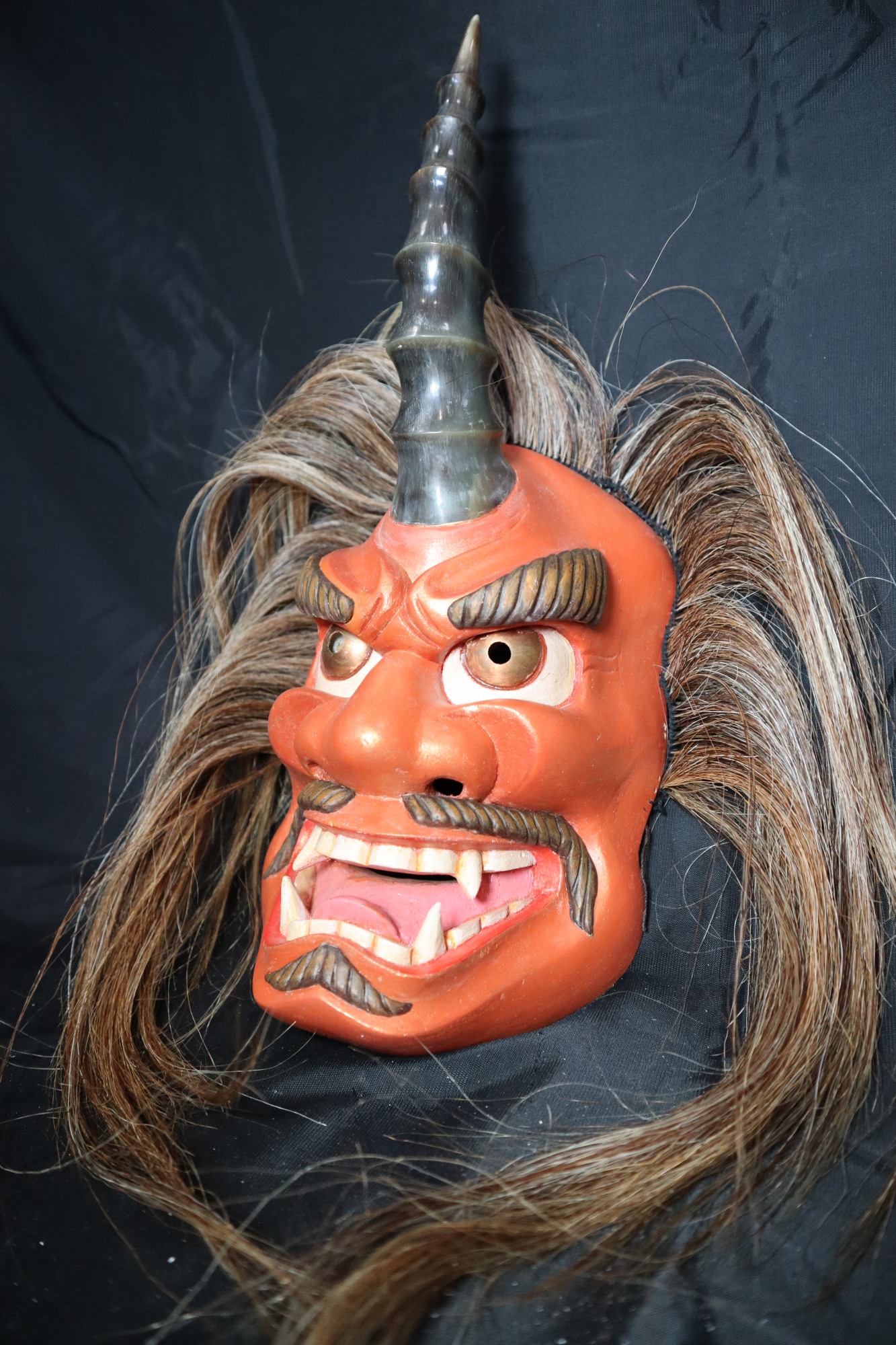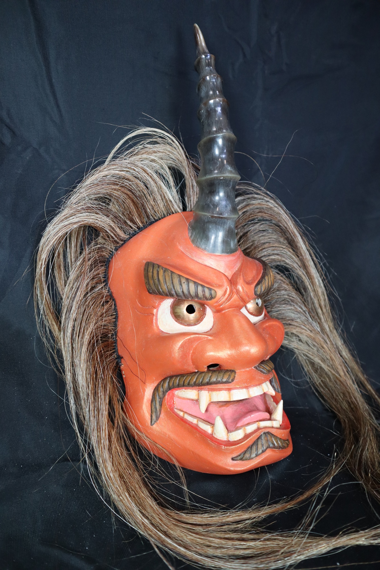 Full mask of male figure with a single modified/carved buffalo horn in center of forehead and light brown/blonde hair. Expression of mask is angry. Eyebrows painted brown and carved to point upward on the sides of the forehead and slightly covering the top of the eyes. Carved lines and furrowed brow wrinkles in the center of forehead. Eyes are pounded copper circles with holes punched through center, outlined with red paint and white paint on the sides. Separated mustache extends to sides of mouth and then goes downwards, painted brown. Mouth carved wide open to expose top and bottom teeth, and tongue. Lips painted red, tongue painted light pink, teeth painted white. Full set of teeth exposed with flat smooth edges, except the incisors and bottom canines are very long and pointy. Lower lip has patch of hair carved in a wide fishtail shape, with side pointing in each direction, also painted brown. Overall mask painted a dark reddish/orange color.