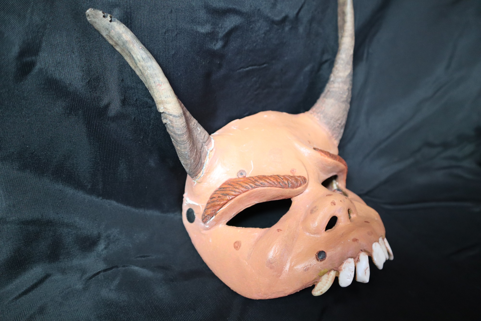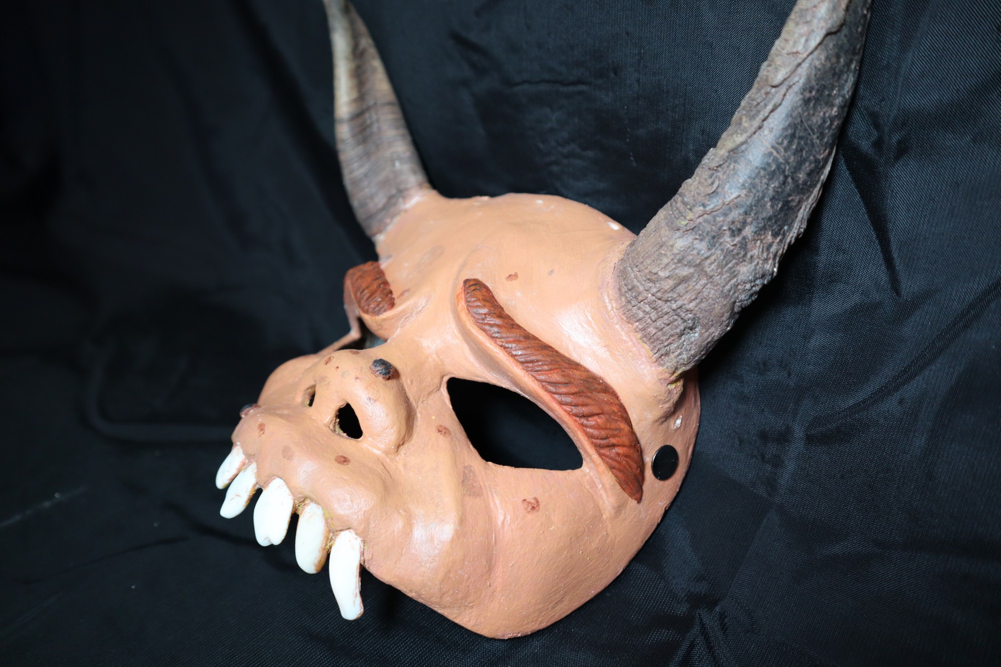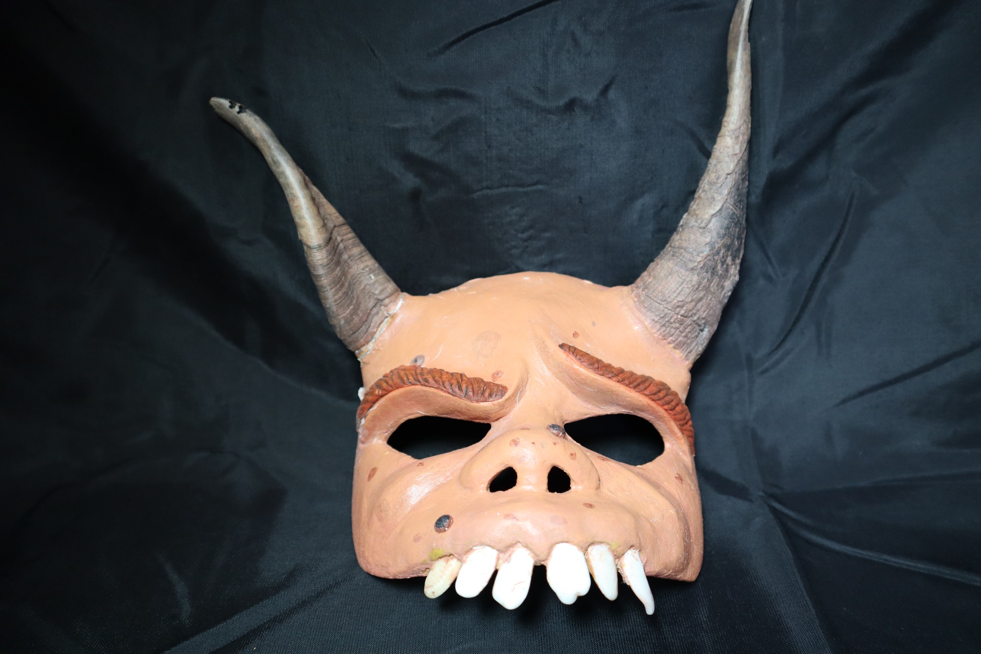 Half mask of human face with horns on top of head. Expression is questioning. Sculpted eyebrows painted reddish brown and carved with hair lines. Left eyebrow is raised with the inner edge pointing up. Mask has little brown and black moles painted and sculpted all over on forehead, cheeks and nose. Nose is sculpted to turn upwards with one big mole above left nostril. Six shell teeth of varying shapes and sizes protrude from bottom of mask.