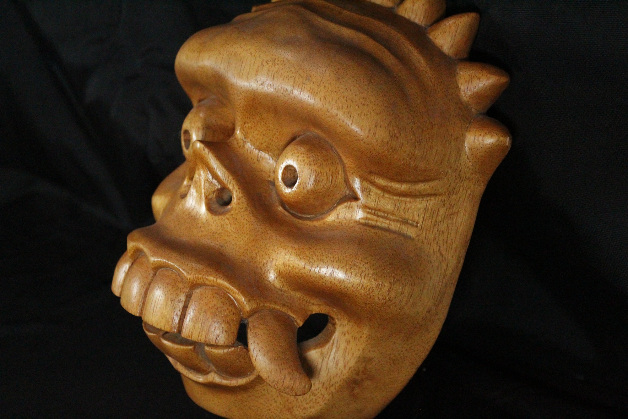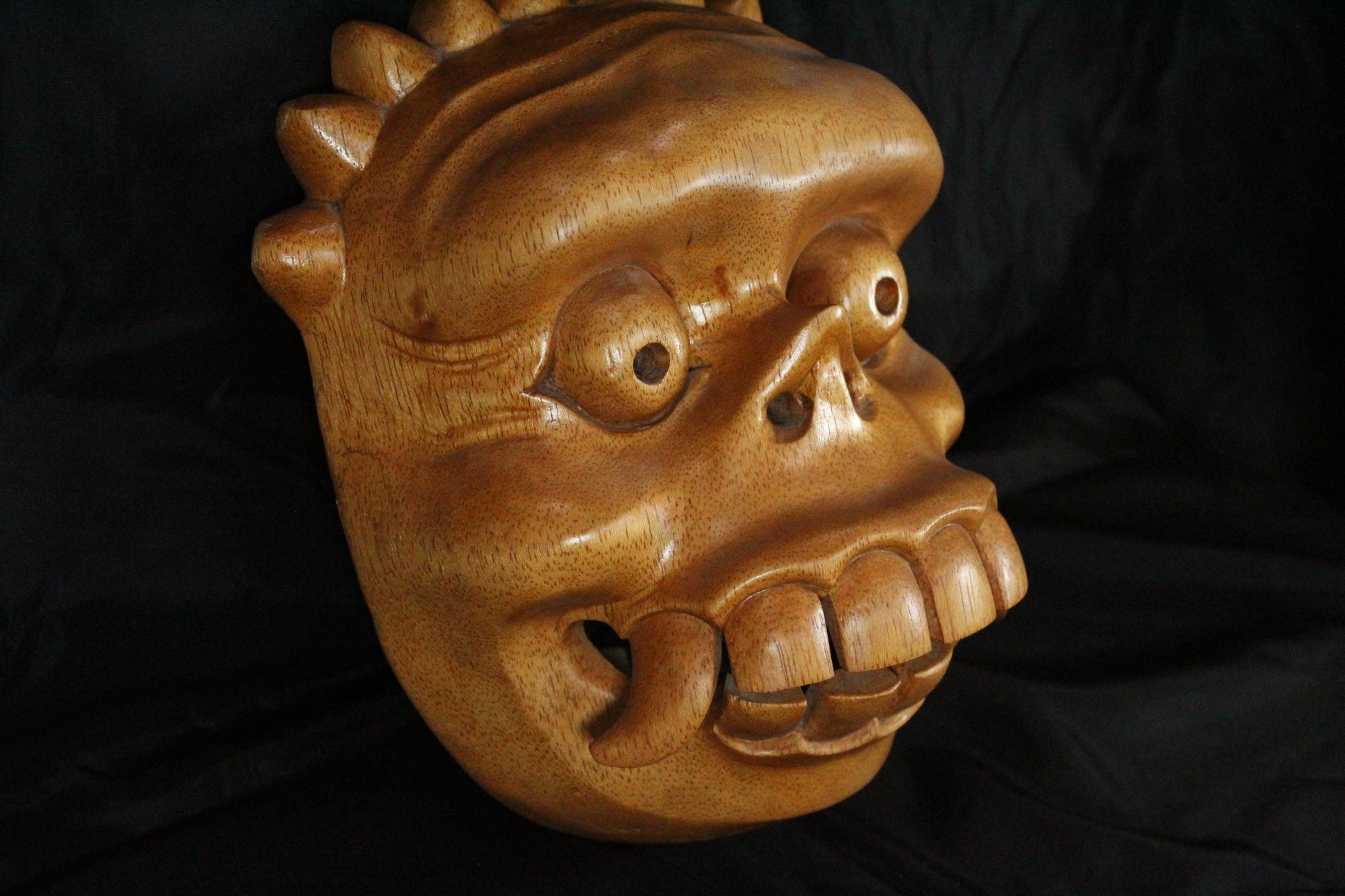 Round, circular eyes carved with circle pupils punched out. Flat nose with round nostrils carved and punched out. Six large teeth on the top row, with gaps in between and canines on the ends, extending outwards. Four large teeth on the bottom row with gaps in between. Ten spikes carved on top of the head.