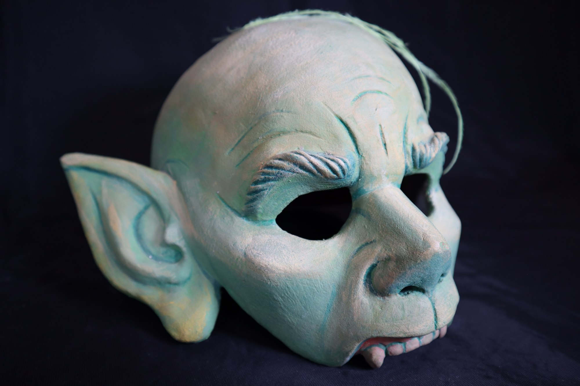 Duende. Plaster bandage, paper clay, feathers, painted with acrylics. Half mask helmet for theatrical production at ASU in Tempe campus. Green monster/demon character with pointed ears and pointy upturned nose, and pointy teeth. Little strands of green feathers for hair on top of mask.