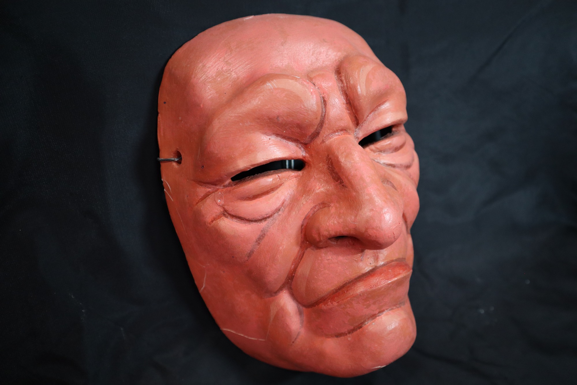 El Enojado. Plaster bandage, paper clay mask of old man figure, painted with acrylic paints. Face is covered with carved and painted wrinkles. Bumpy eyebrows are raised over slitted eyes, with bags and wrinkles painted under slits. Mouth is closed in a frown with large lower lip covering upper lip. Cracks along right side of mask on edges, cheek, and chin.