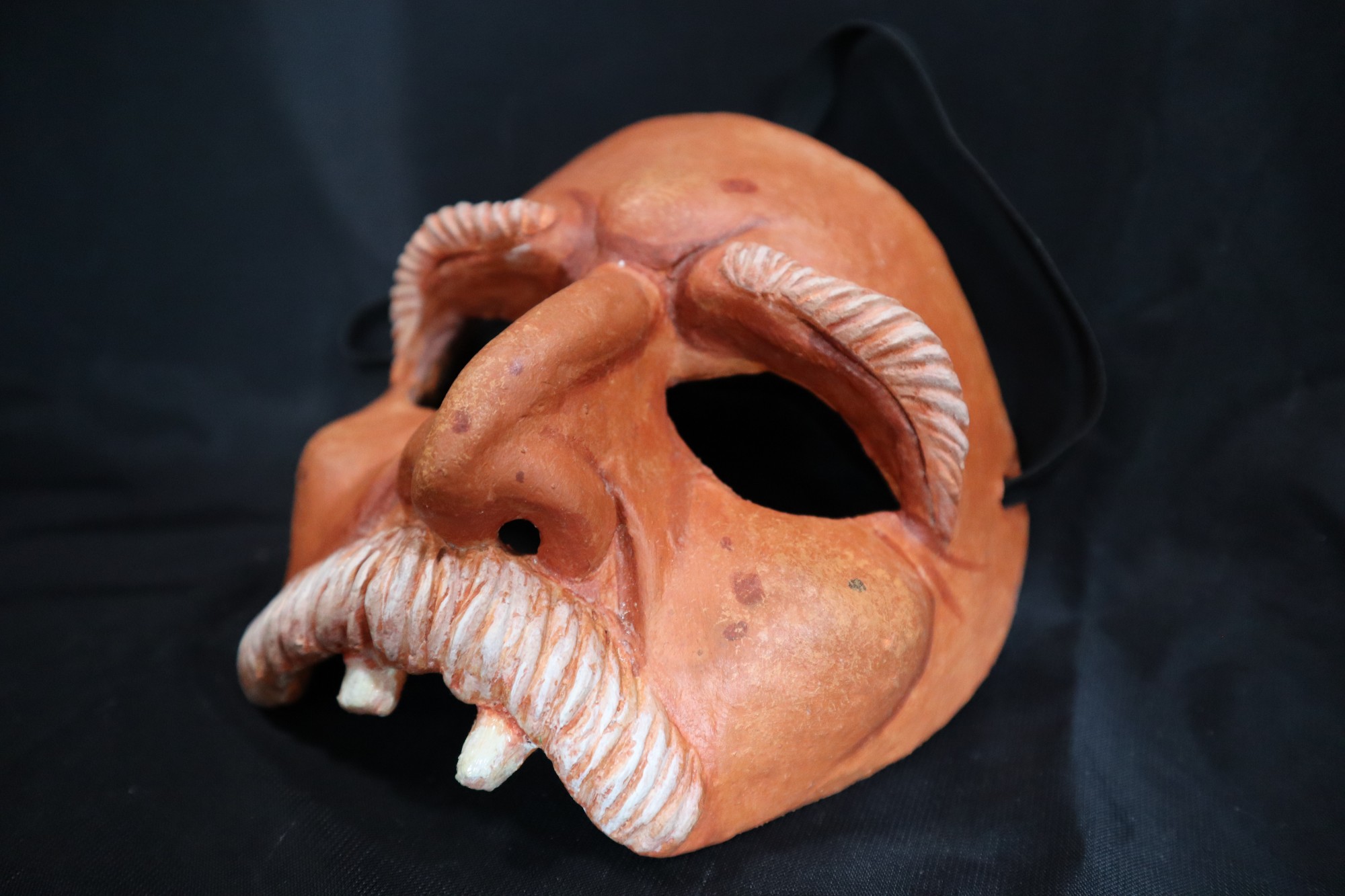 El Viejito. Half mask, plaster bandage. paper clay painted with acrylics. Old man character made for the viejito dance, performed by Primavera Ballet Folklórico, one of the oldest continuously performed dances from the Mexican state of Michoacan. White eyebrows and mustache. Face is slightly crooked and raised on the left. Lots of age spots painted on face. Two white teeth with a big gap between them protrude from upper lip.