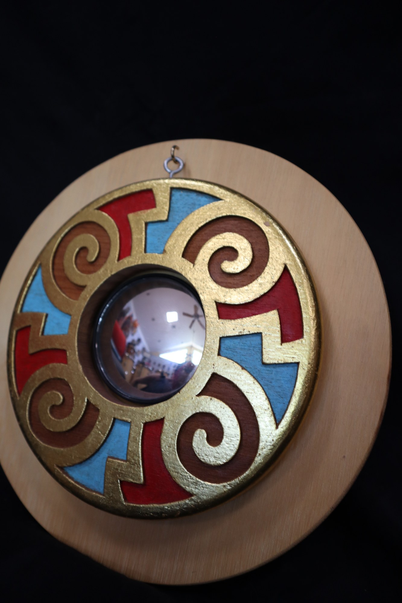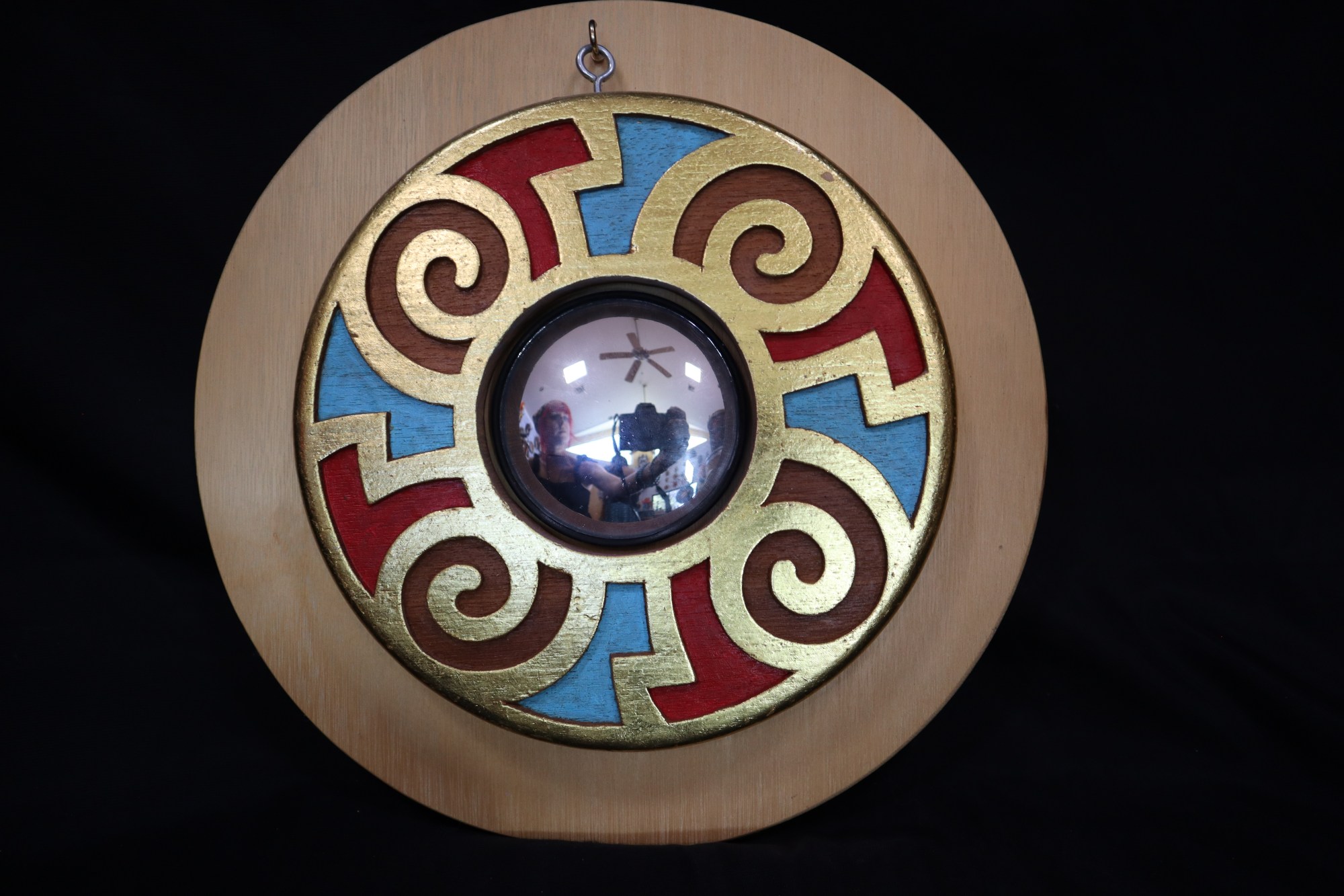 Circle mandala. Inner circle painted gold, red, and blue. Mirror placed on the center of mandala. Gold border surrounding the mirror, with swirl patterns. Red and blue accents between the gold swirls. Outer border of mandala left unpainted.