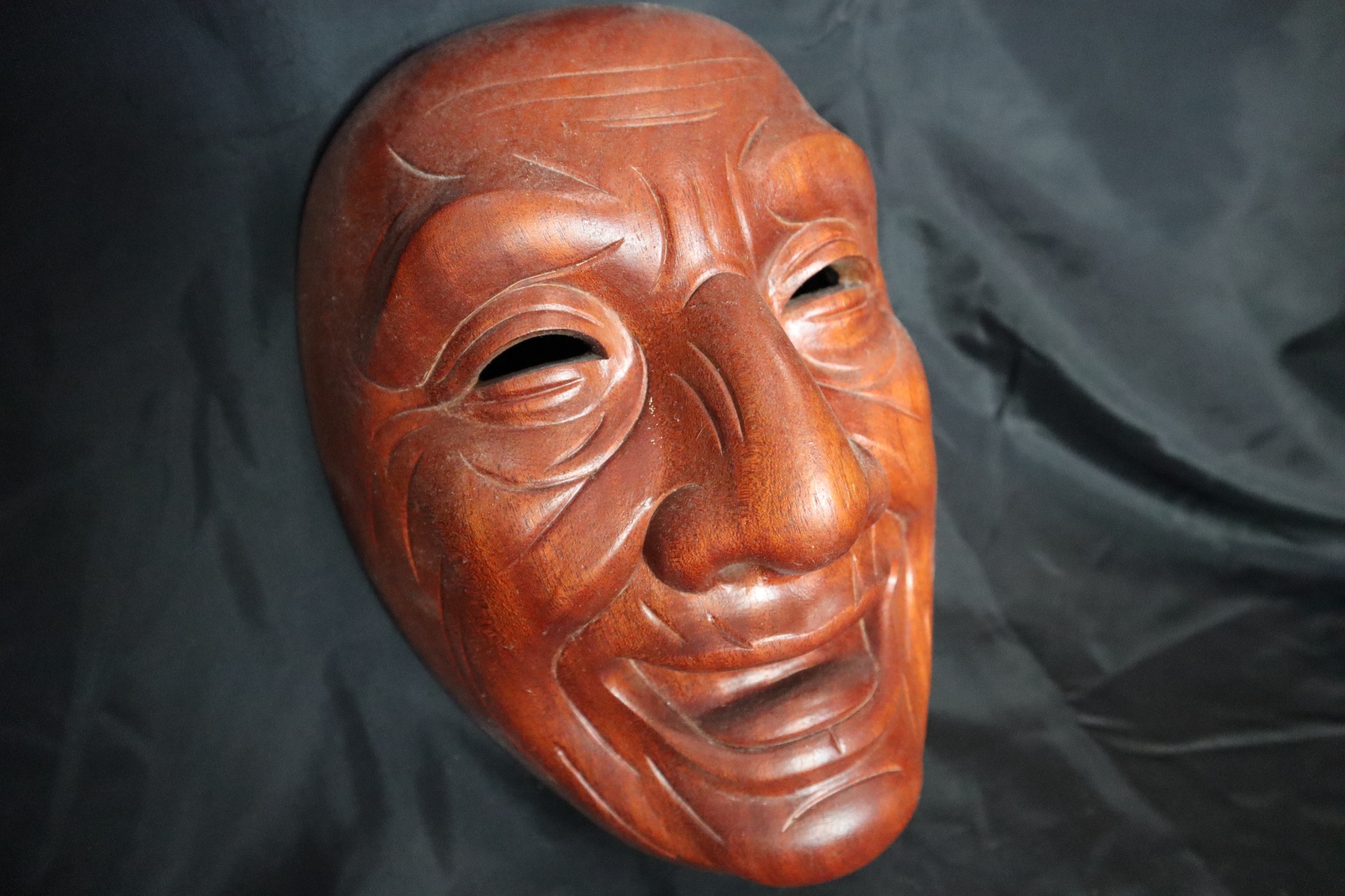 Mask carved with glossy finish. Various wrinkle lines carved throughout entire mask. Three horizontal forehead wrinkles. Three vertical wrinkles between eyebrows. One crease line carved above nose bridge. Narrow, half circle-shaped eyes carved and punched out. Two wrinkle lines carved on eyelids and below eyes to accentuate preorbital puffiness.Two diagonal lines staring on each side of the nose, ending at the middle of the cheeks. Mouth opened, with no visible teeth. Four smile lines above the top lip. One small line carved on the middle of the bottom lip.