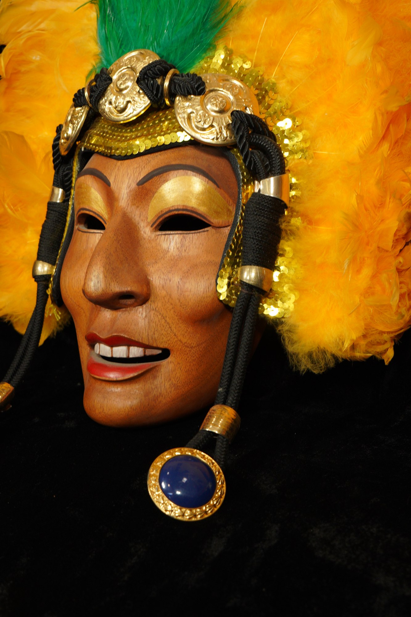Carved wooden mask with gold eye shadow, open mouth with top teeth exposed; yellow feathered headdress with green feathers in top center; brown rope and gold metal pieces and sequins around the hairline of the headdress
