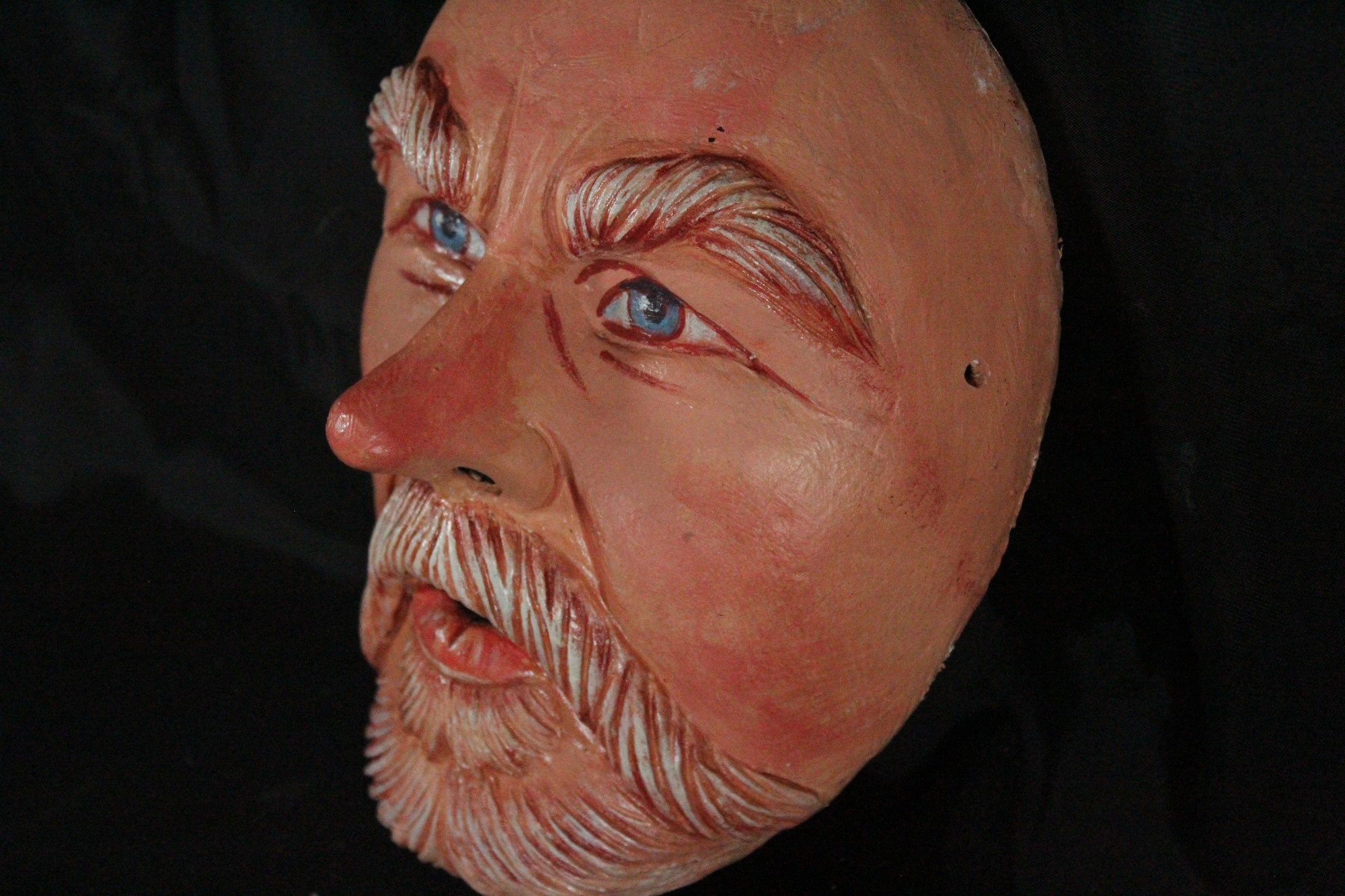 Full face handheld mask male figure. Overall face painted light tan with red undertones, especially around nose and cheeks in a furrowed brow expression. Wrinkles carved in between brows, and along sides of nostrils, and painted brown around eyes. Raised sculpted eyebrows, mustache and beard with carved hairlines, painted white with reddish brown accents. Eyes have blue iris with brown outlines and white on either sides. Mouth is parted open with bottom lip sticking out and painted pink.