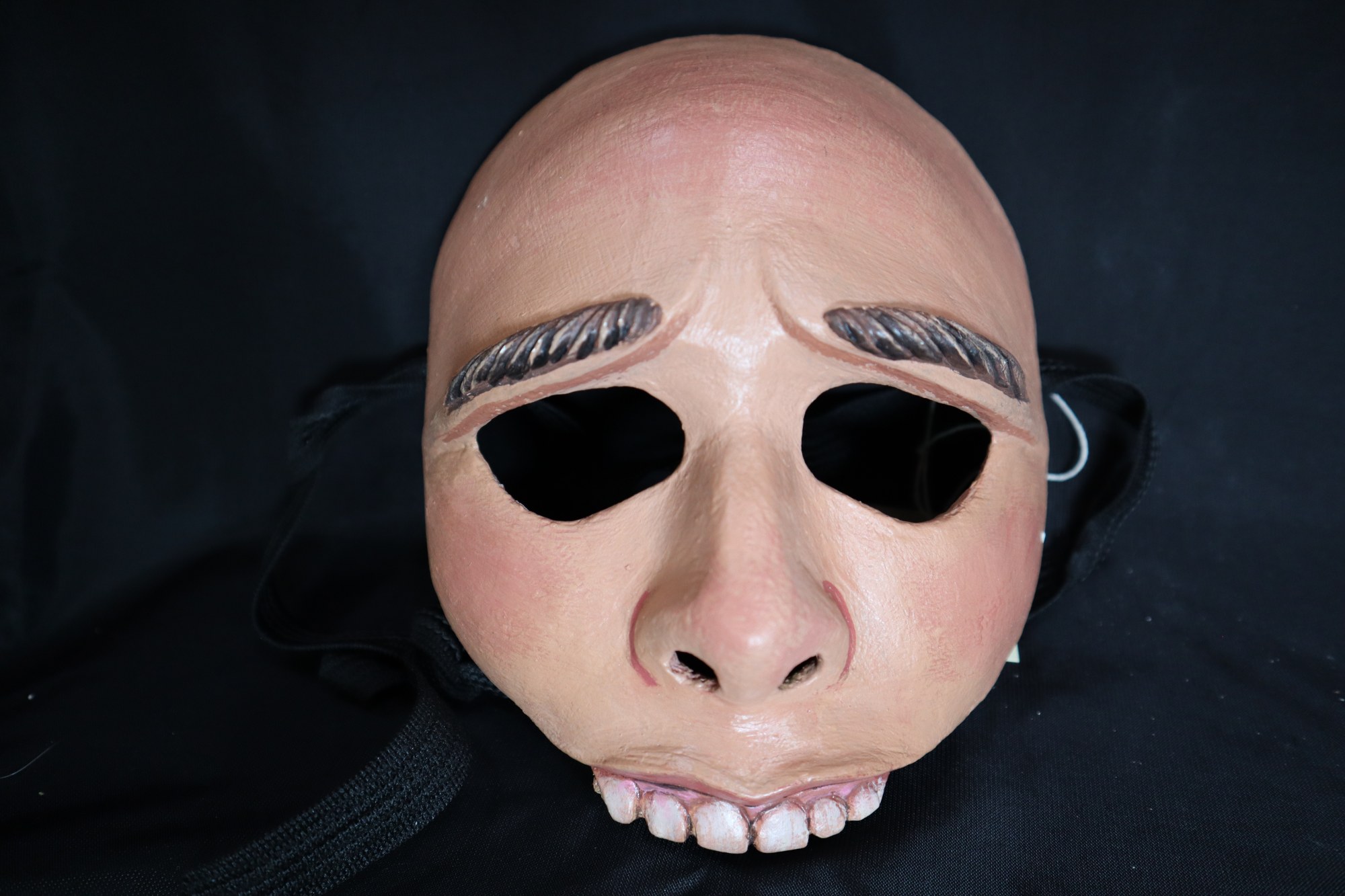 Julie. Plaster bandage, paper clay half mask of woman figure. Acrylic painted face. Mask painted light color, with rosy forehead and cheeks. Smooth face with thick eyebrows sculpted slightly down at the ends. Eyebrows painted dark brown with light brown brow line under each eyebrow. Light brown lines painted around nostrils. Thin upper lip painted light pink. Six painted white teeth protruding from upper lip, with painted pink gums.
