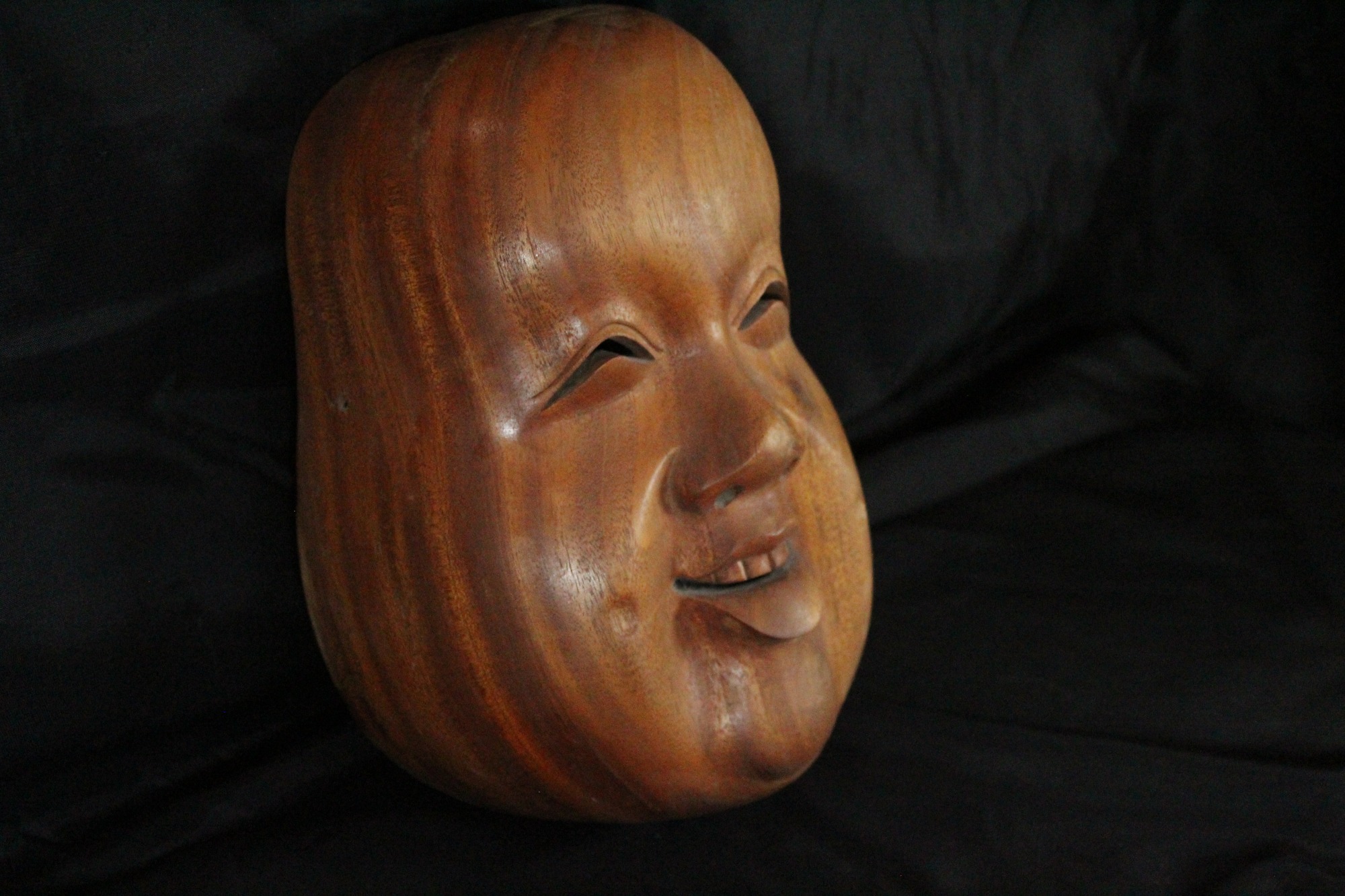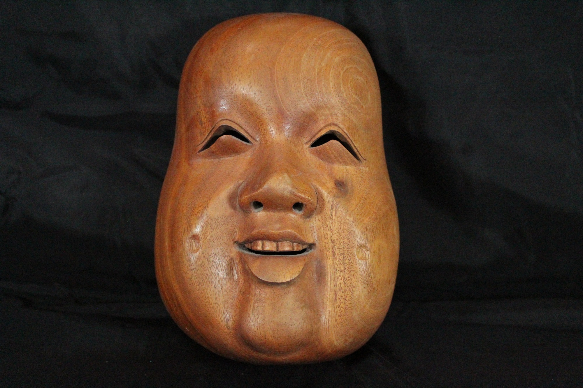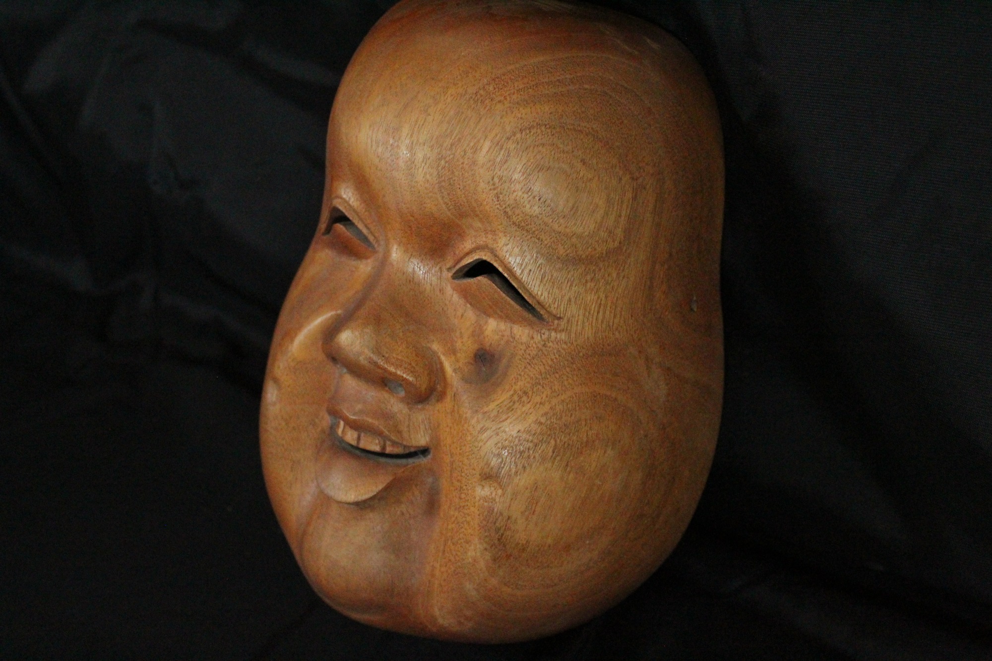 Narrow forehead with wider bottom profile. Circle wood lines on the right side of forehead. Wood grain dot below the right eye. Boomerang shaped eyes with a shallow line carved on the eyelids. Small mouth smiling with the top row of six teeth showing. Thin upper lip, thick bottom lip. Shallow dimples carved on each side of the mouth.
