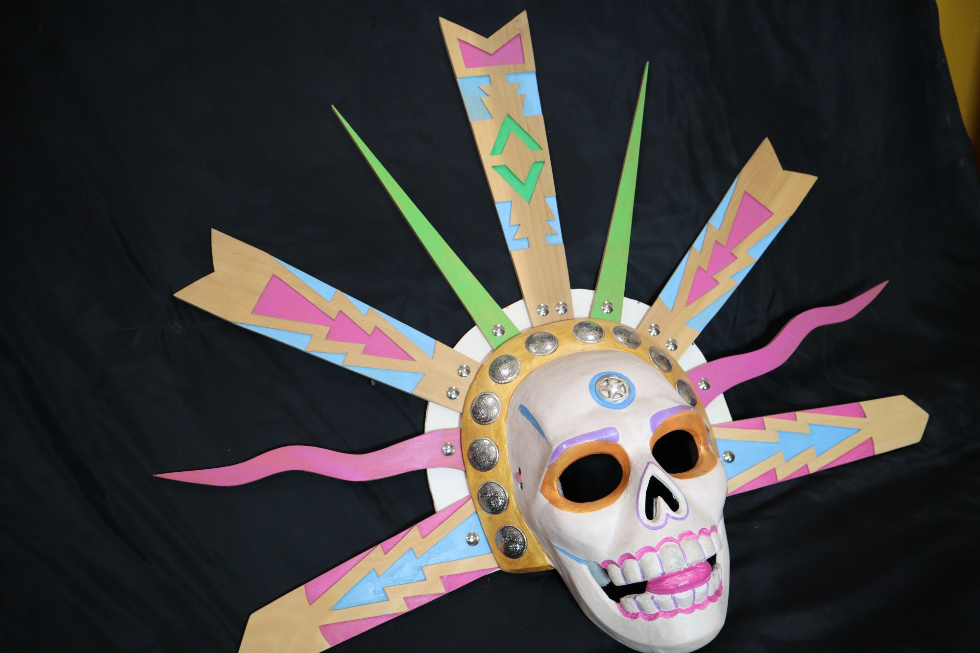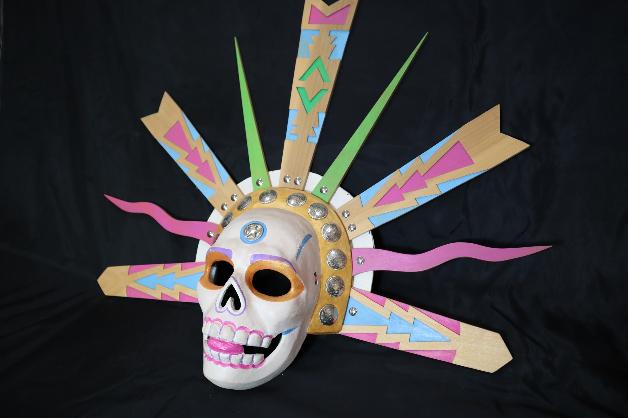 Calaca mask surrounded by blue, pink, and green planks; created by artist to represent the rays of the sun and embody the "energy of life." Outside crown perimeter painted in yellow and embellished with silver metalcraft pieces. Rectangular middle plank with indentation and southwest designs carved in blue, pink, and green. Followed by two green triangular shaped rays on each side, two planks with indenations and a blue and pink southwest patterned carved in, two squiggly shaped pink rays, and finally two planks with sharpened edges that contain an arrow shaped southwest design, carved into planks and painted in blue and pink.