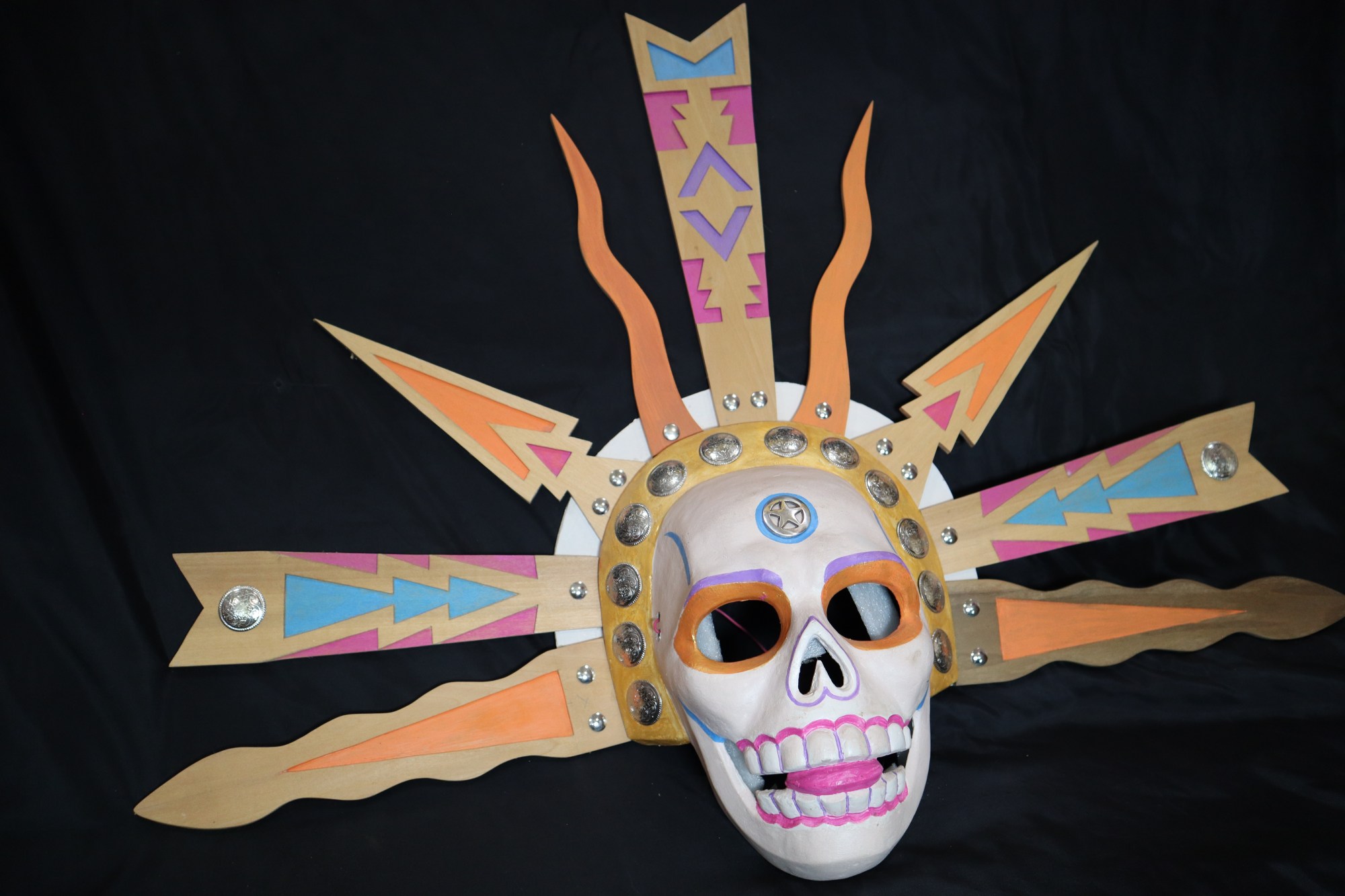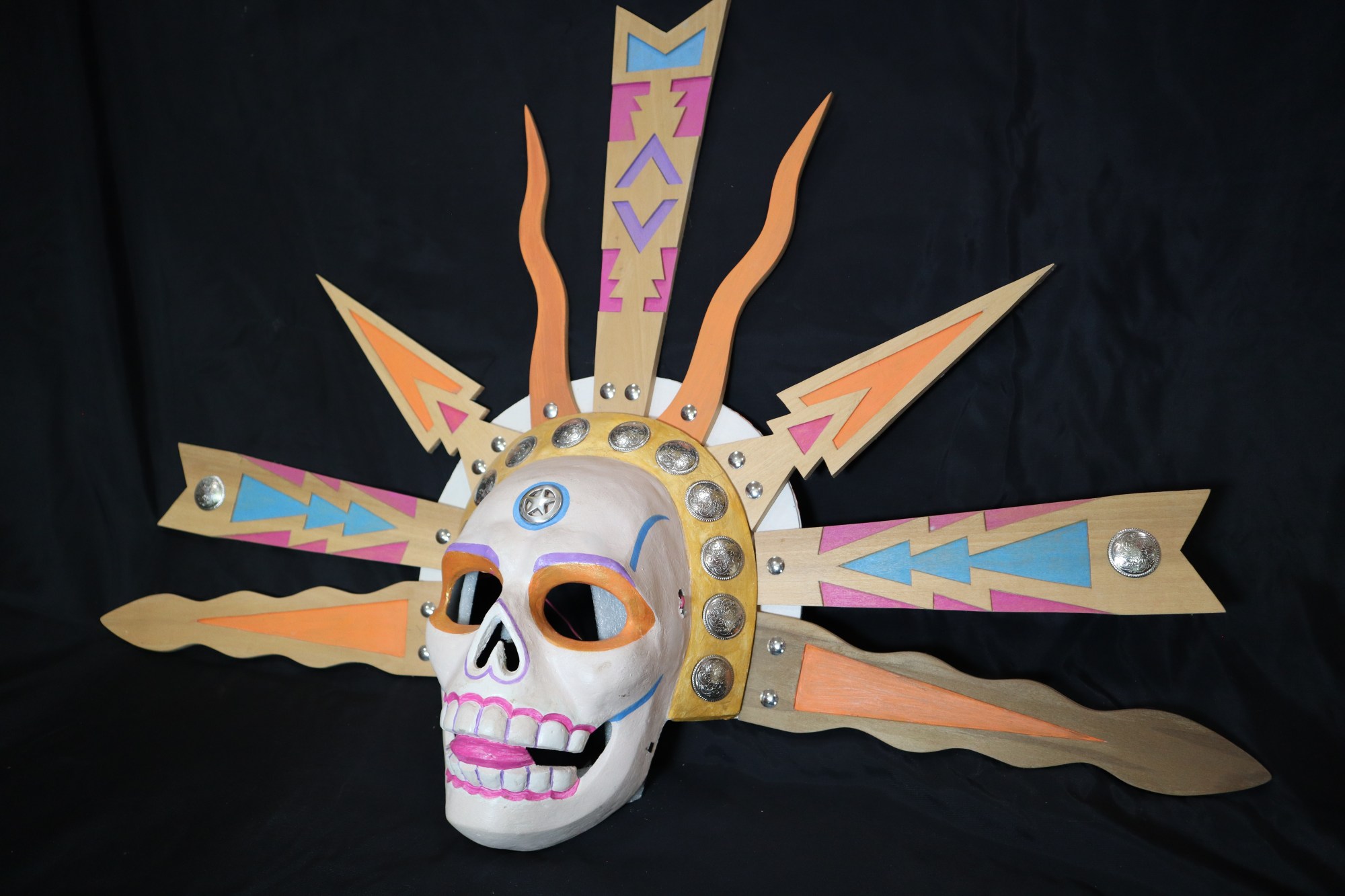 Calaca mask surrounded by blue, pink, purple, and orange planks; created by artist to represent the rays of the sun and embody the "energy of life." Outside crown perimeter painted in yellow and embellished with silver metalcraft pieces. Rectangular middle plank with blue, pink, and purple southwest designs carved in and an indentation at the edge. Followed by two orange, sguiggly shaped rays on each side, two overlapping triangular arrows with orange and pink carved in, two more planks with indentations at the edge and blue and pink southwest arrow designs carved in, and finally two squiggly shaped planks with with an orange triangle design carved in.