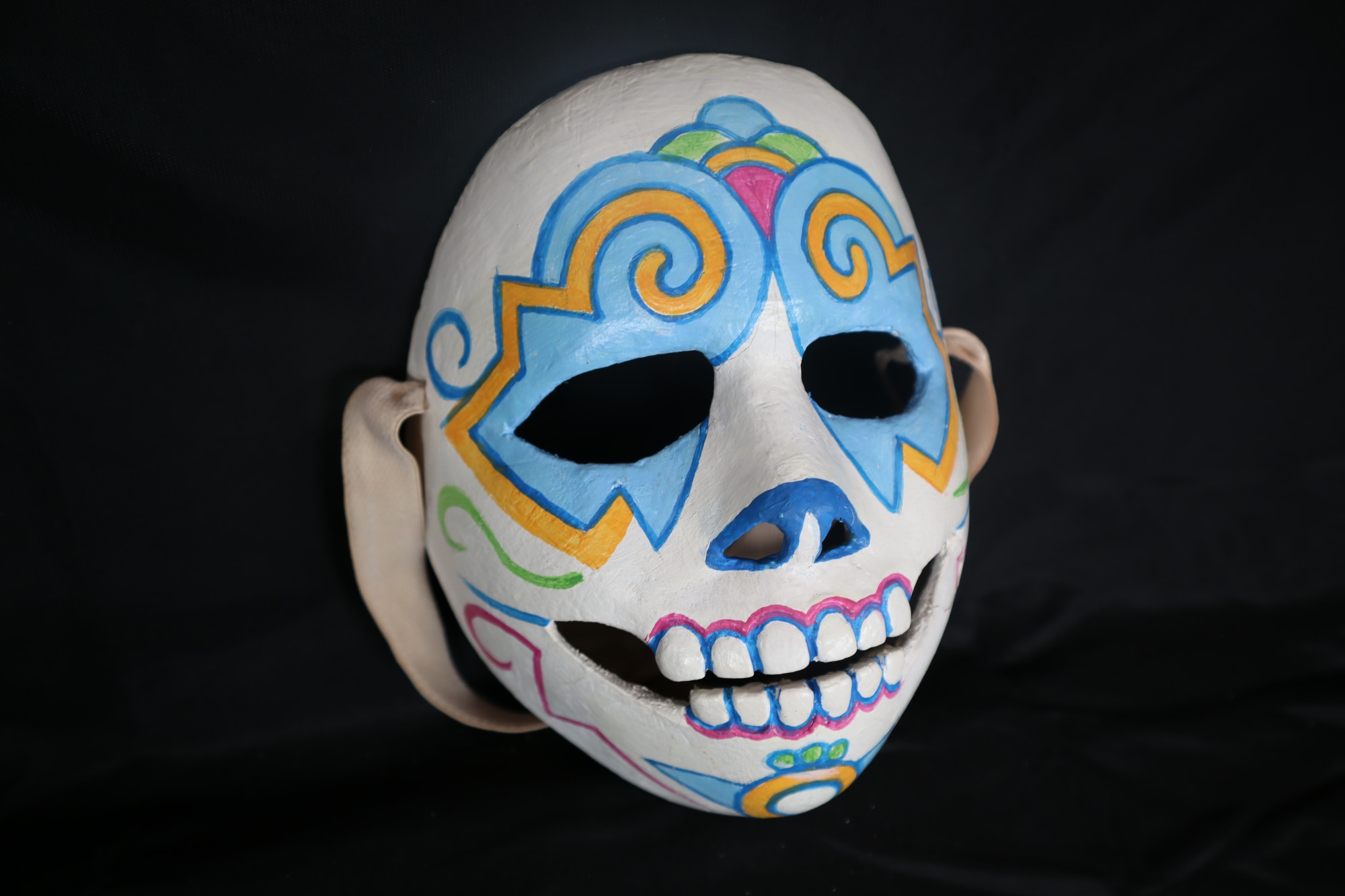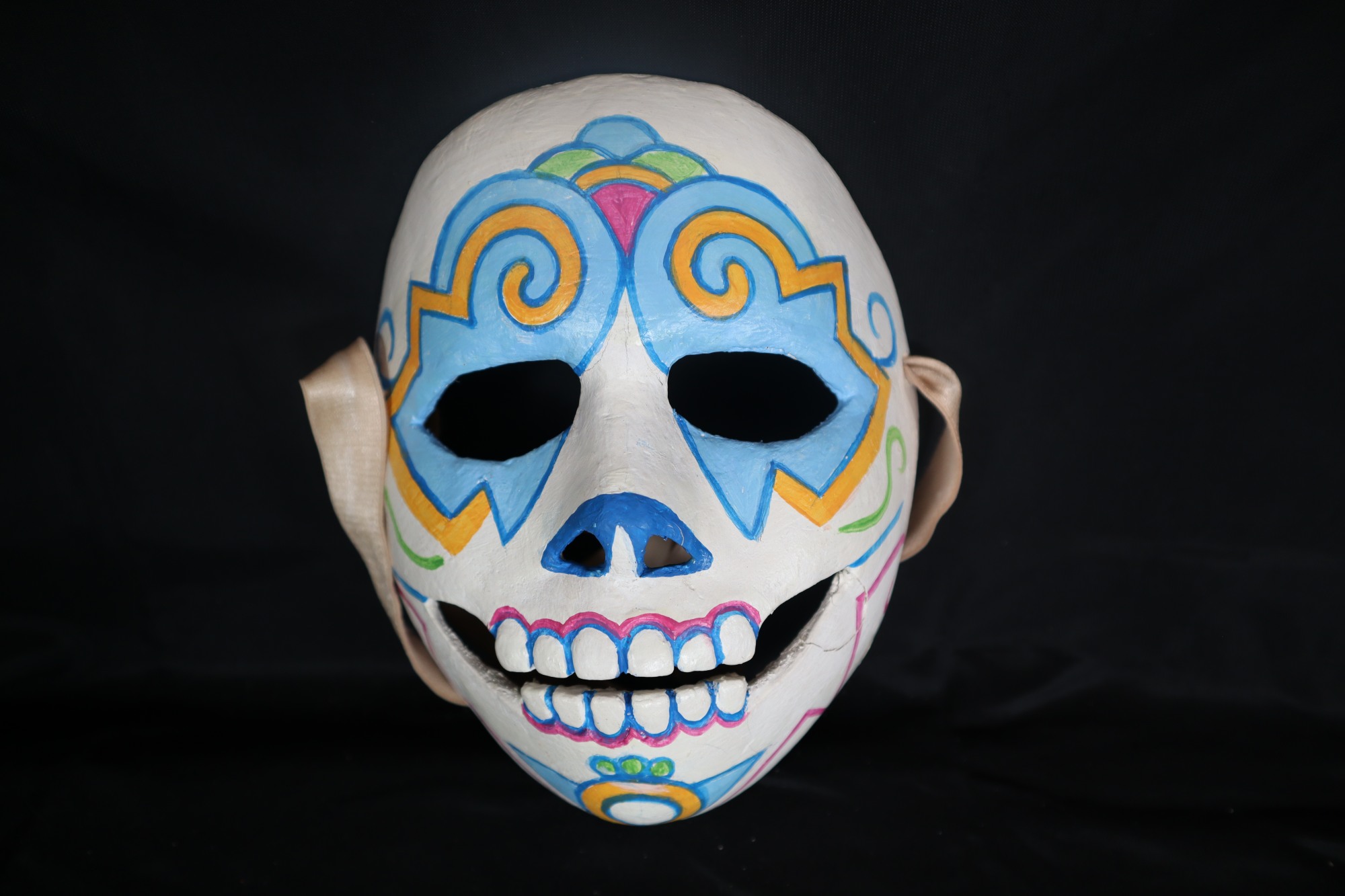 Lílíana. Full face mask used in performances by Ballet Folklorico Quetzalli-AZ of Chandler, AZ. It has a dark blue nose and teeth outlined in dark blue and pink. Surrounding the forehead and eyes, it has an Aztec-like pattern in light blue and gold swirls with pink and green half circles at the top. The cheeks have light green, blue, and pink lines across them, and the chin has a forehead matching gold, blue, and green design.