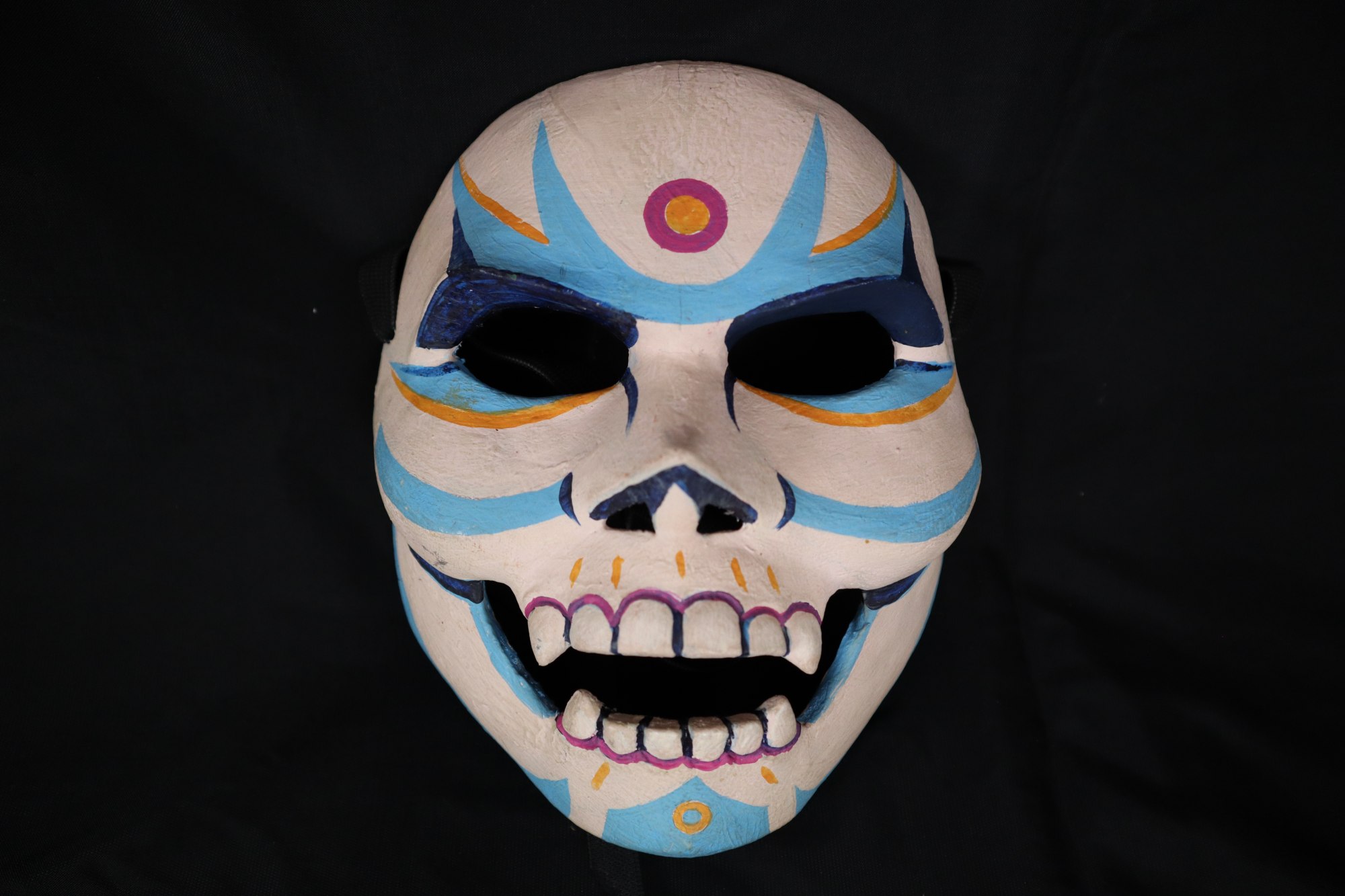 Mai is a full-face mask blending human, animal, and demon figures. It is made of plaster bandage and paper clay, painted with acrylic paints, and ribbon, which ties the mask to the performer. The colors are light blue, dark blue, magenta, with orange/gold designs painted on the forehead, cheeks, and around the mouth. It also has orange and magenta circles painted in the center of the forehead and an orange circle painted on the chin. The mouth has animal-style teeth and fangs outlined with magenta and dark blue paint. The mask's expression is almost smiling.