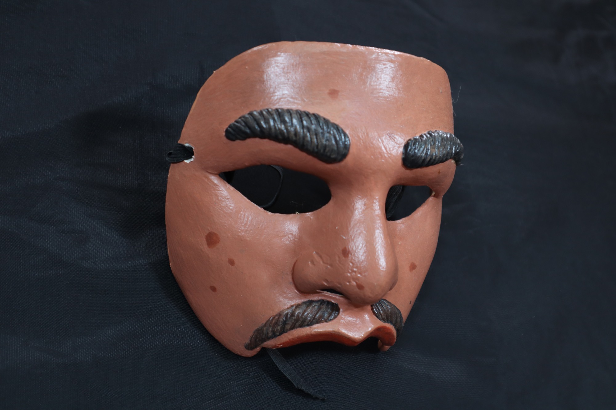 Mambo. Half mask of male. Dark brown/black painted eyebrows and split mustache. Face has little spots painted all over it. Made for the theatrical production Bocon in 2000.