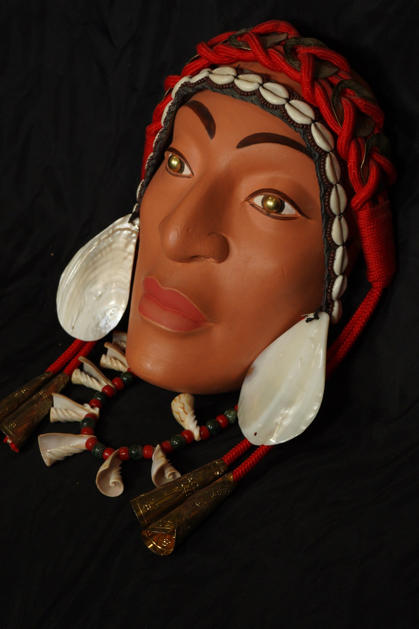 Sol y Mar "Maya" is a carved wooden mask, painted with acrylic. It has with brass button eyes, a white and black cowrie shell headpiece with red cordage, a brass headpiece, mother of pearl earrings, and a necklace made of black and red seeds with sea shells.