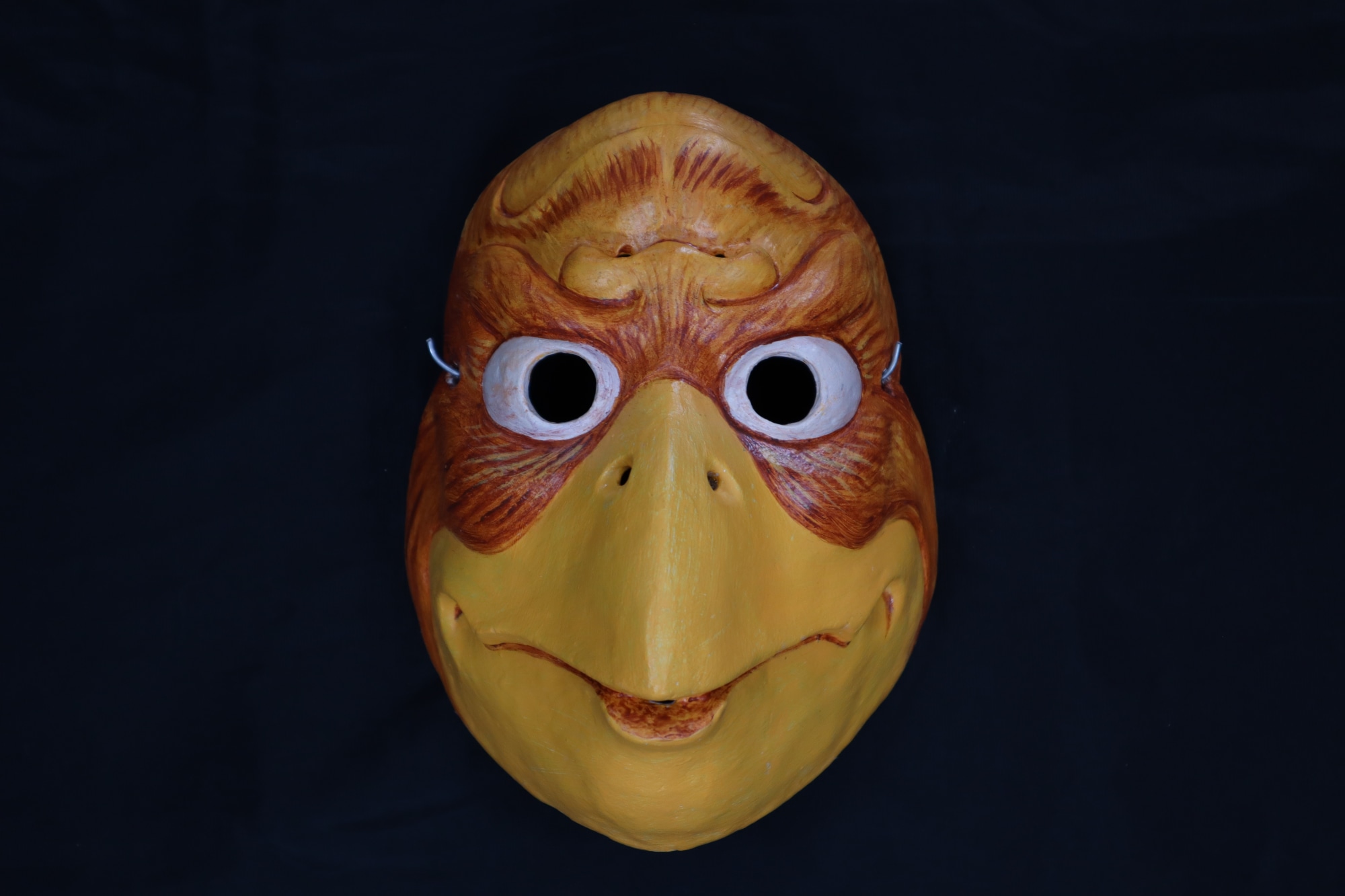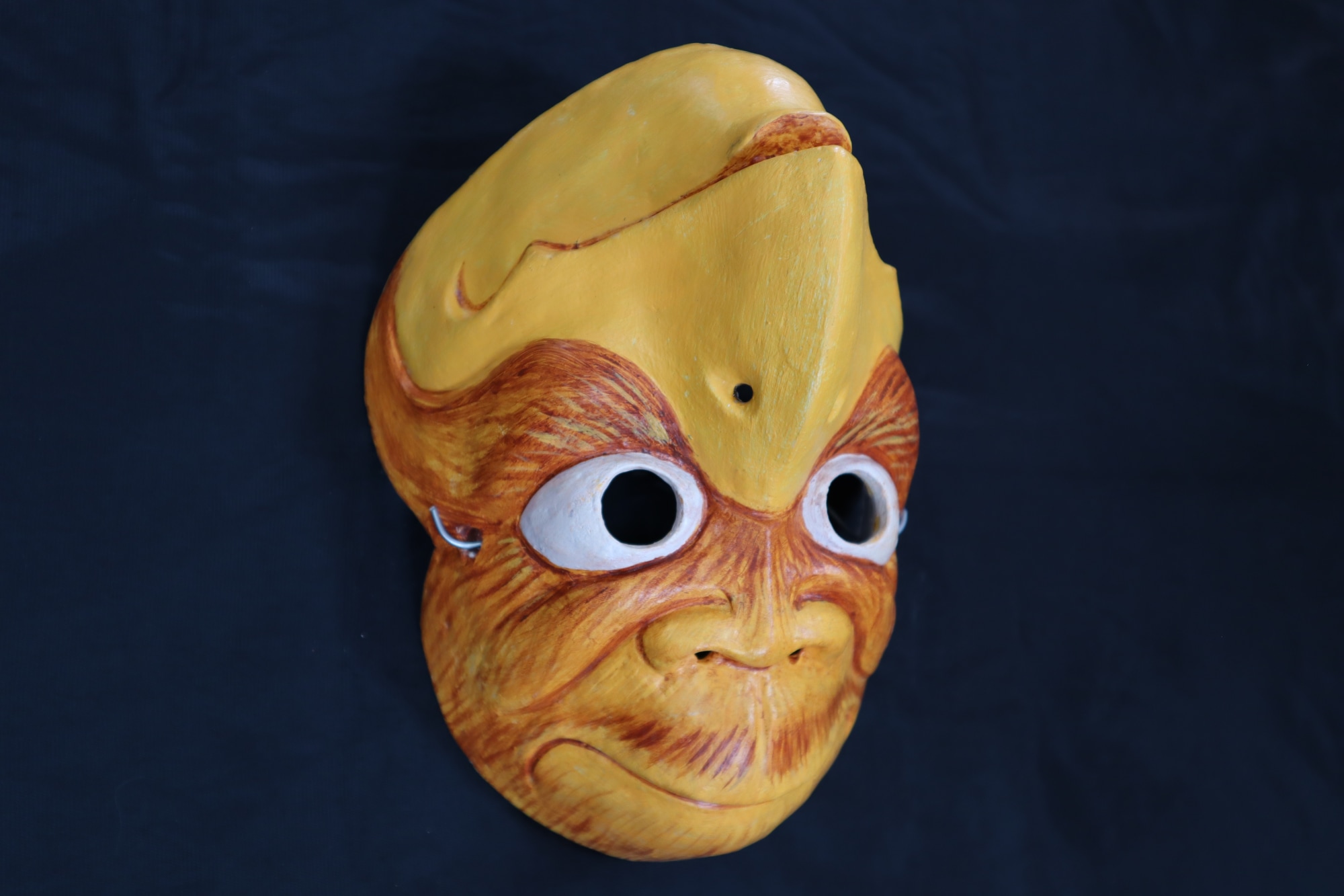 (1 of 2) Monkey and Bird double full faced mask based on ancient Japanese story. Front of mask is either a monkey face with an upside down bird on forehead, or a bird face with yellow beak and a monkey face upside down on forehead. Originally carved in by artist while in Japan in 1986 for Mariko dance company. Reproduced in 2012, cast in fiberglass.