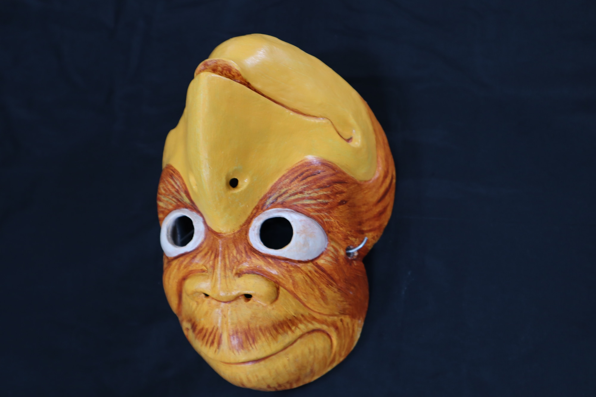 (1 of 2) Monkey and Bird double full faced mask based on ancient Japanese story. Front of mask is either a monkey face with an upside down bird on forehead, or a bird face with yellow beak and a monkey face upside down on forehead. Originally carved in by artist while in Japan in 1986 for Mariko dance company. Reproduced in 2012, cast in fiberglass.