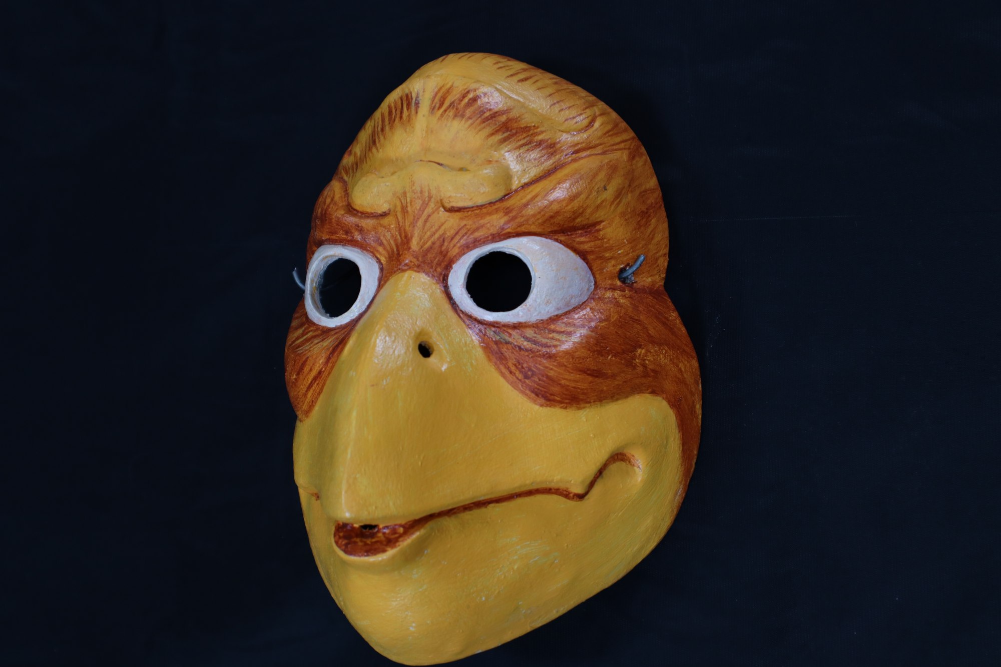 (2 of 2) Monkey and Bird double full faced mask based on ancient Japanese story. Front of mask is either a monkey face with an upside down bird on forehead, or a bird face with yellow beak and a monkey face upside down on forehead. Originally carved in by artist while in Japan in 1986 for Mariko dance company. Reproduced in 2012, cast in fiberglass.