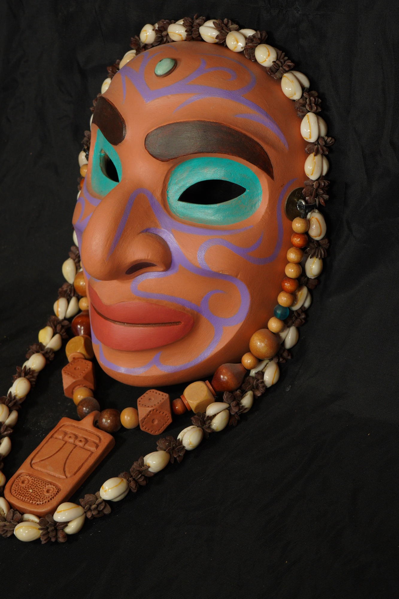 Mystico is a carved wooden mask, painted flesh tone, with violet colored designs around the entire face, and turquoise paint around the eyes, with a round turquoise stone on forehead.