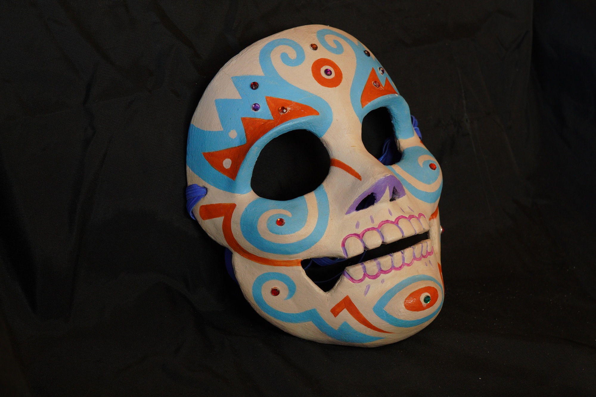 Calaca mask with off-white painted base. Red and blue color scheme, with small pink and purple details. Two large sections of forehead painted in blue, swirling at the center, creating a heart in the off-white space. Red triangular shapes for eyebrows. Blue cluster on each side of the cheek with and off-white swirl in the middle. Purple nose tip. Top border of teeth outlined in pink, inner border outlined in purple. Small purple stroke marks above and below the teeth. Blue eye-shaped line on the chin with a red oval in the center and a green gem. Eight gems on the forehead. Red gem on each cheek and each side of the mouth.