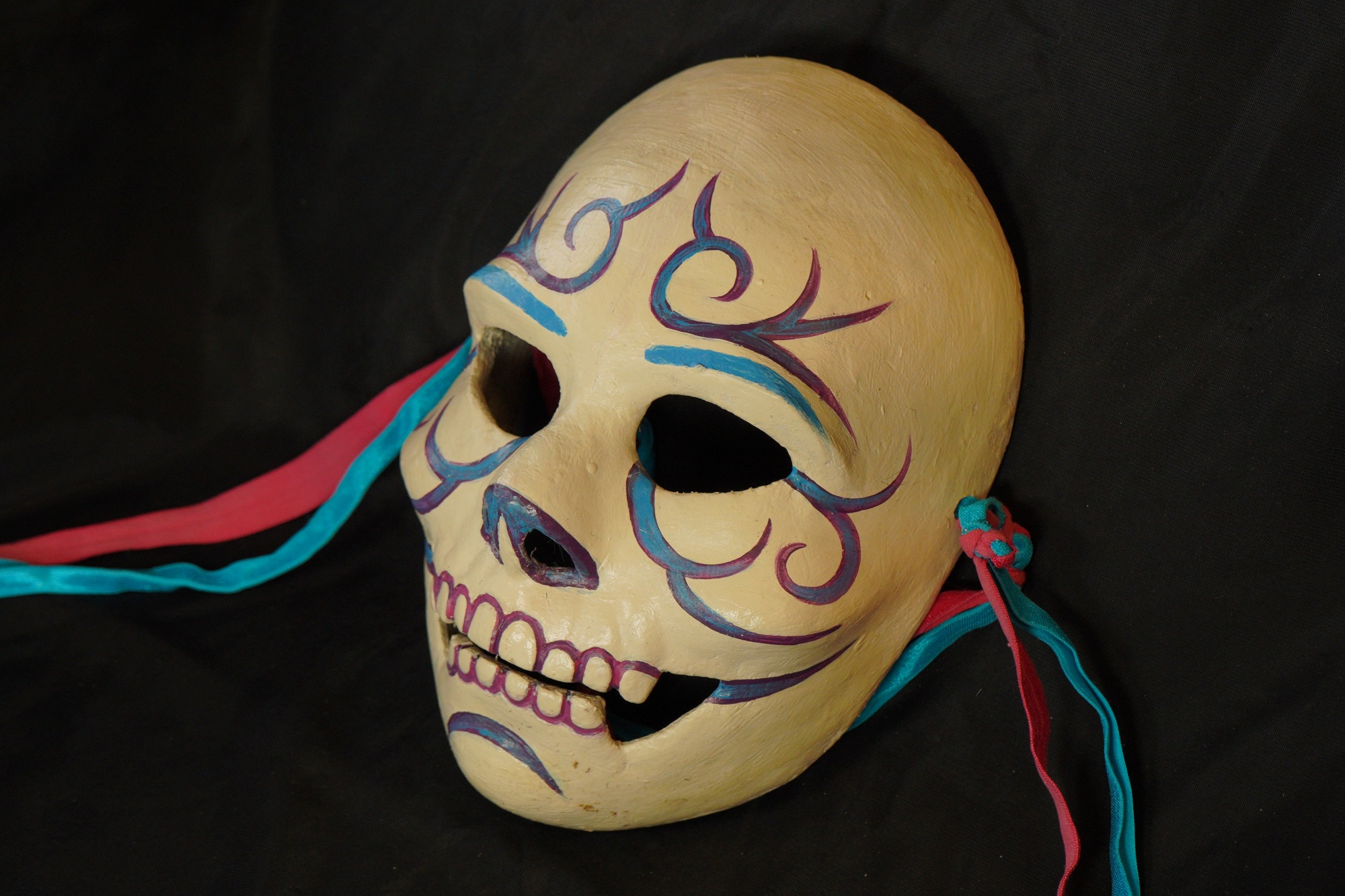 Calaca mask with off-white painted base. Blue and purple color scheme. All line designs painted in blue and outlined in purple. Blue eyebrows, Teeth outlined in purple.